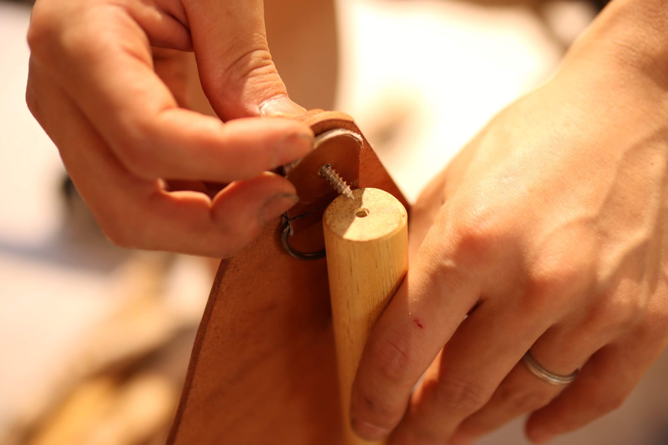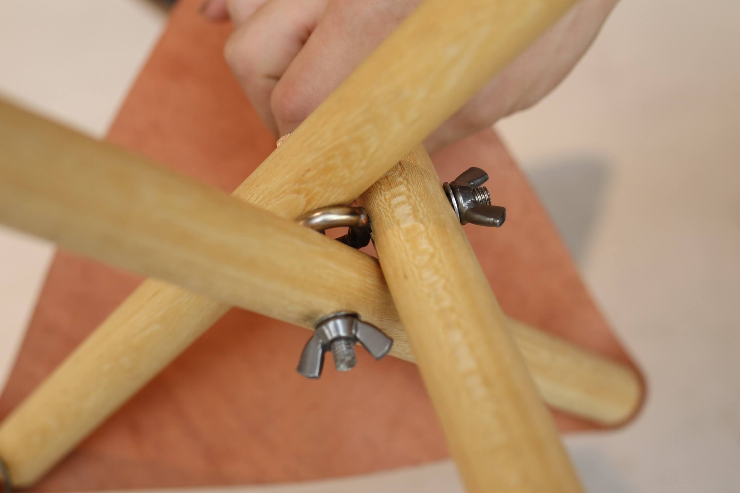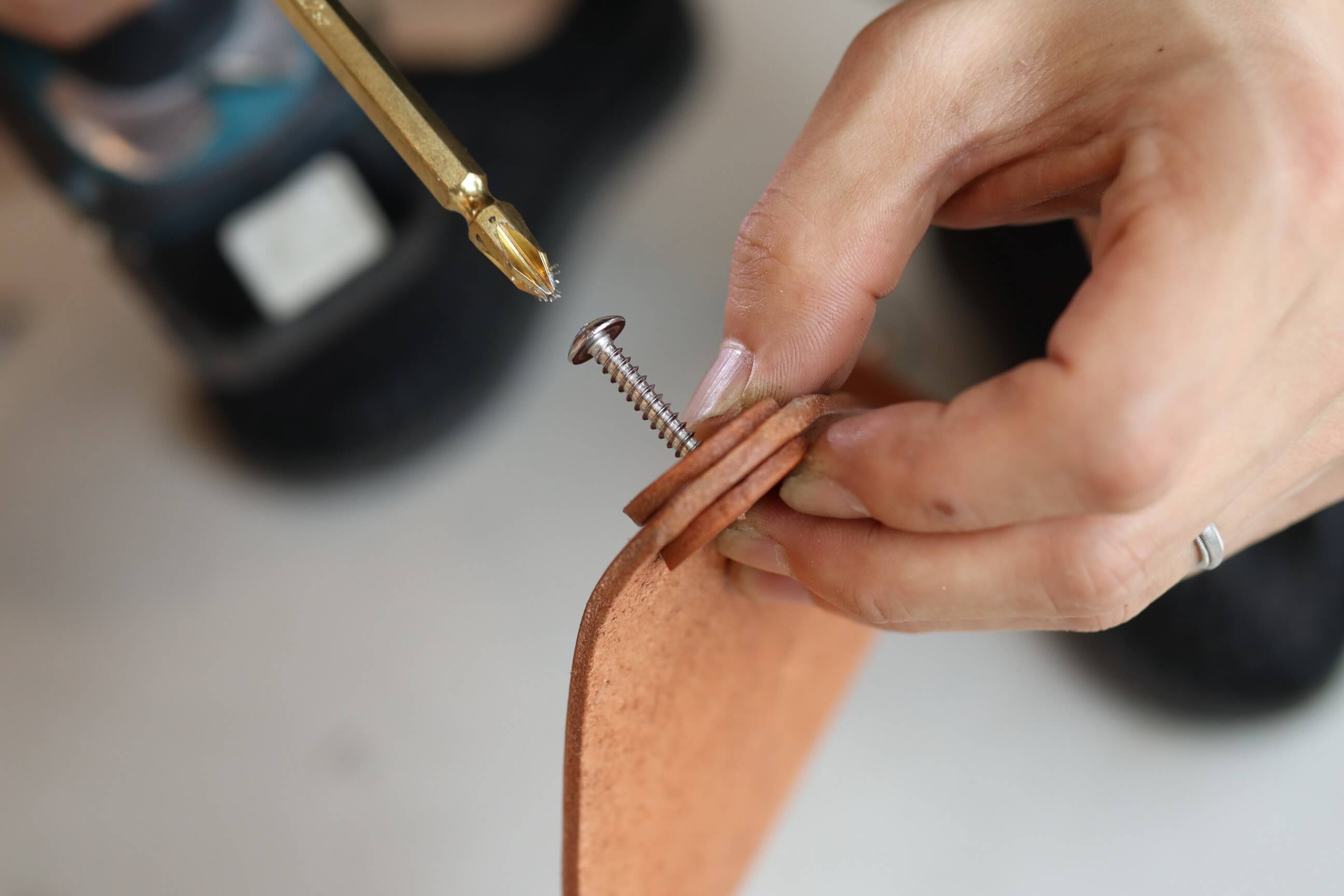 丸型レザーと座面を写真のように3枚重ね、ドリルネジ(M4×24mm)で固定します。
