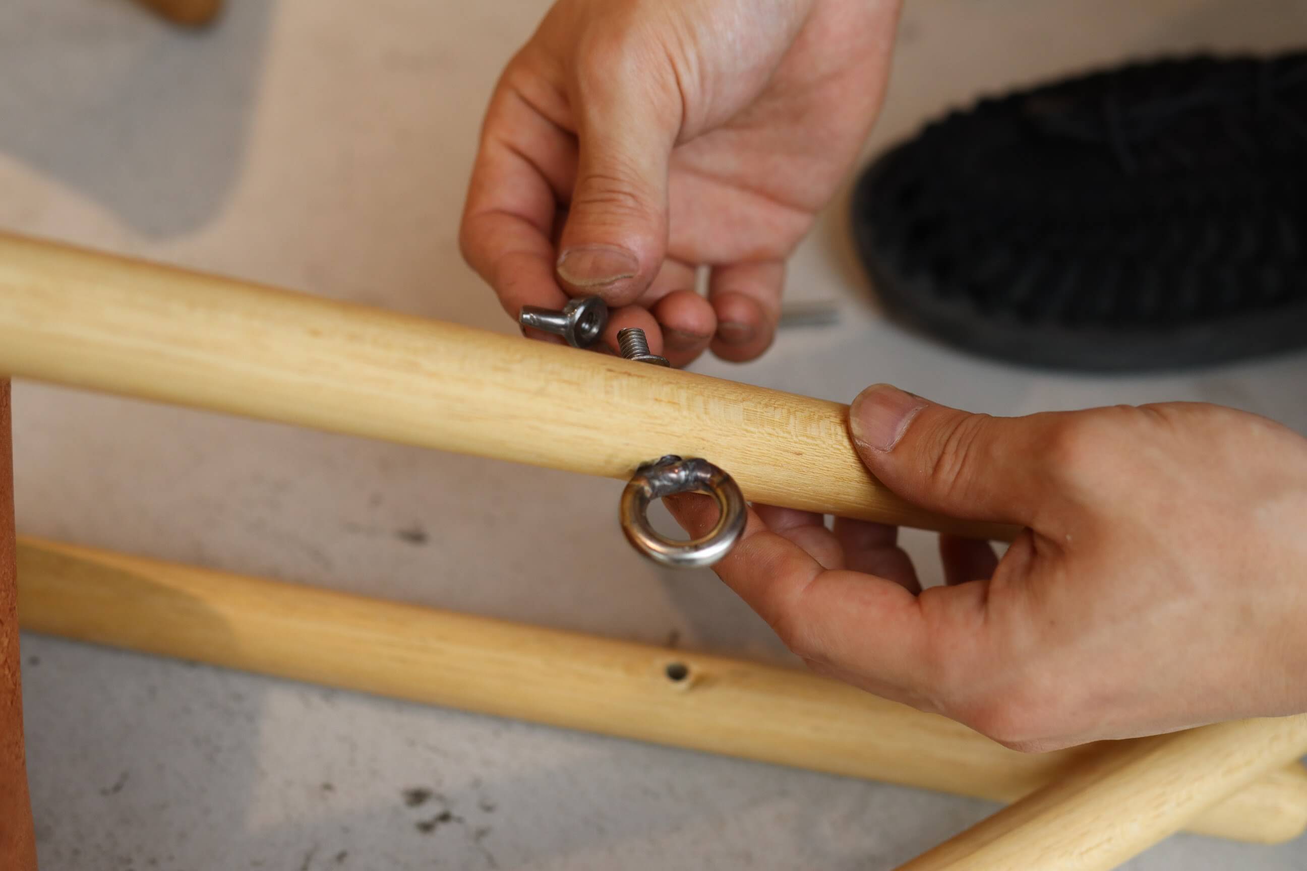 (アイボルトとM6(70mm)、丸棒の位置関係を分かりやすくするために座面をつけたまま撮影しました。)