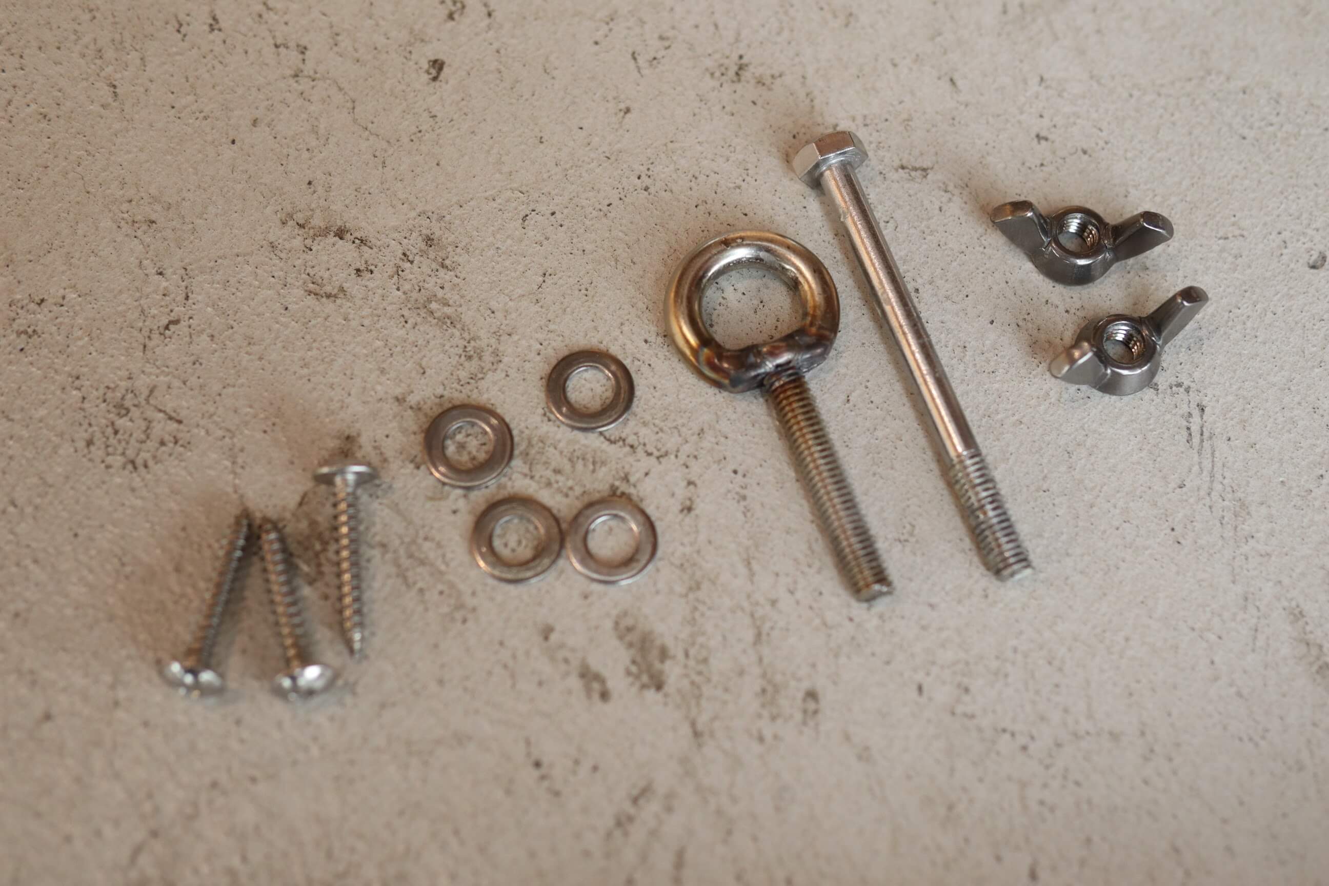 脚の固定パーツ&脚と座面を固定するパーツ一覧。左からドリルネジ(M4×24mm)、ワッシャー、アイボルト(30mm)、M6ボルト(70mm)、蝶ナット。
