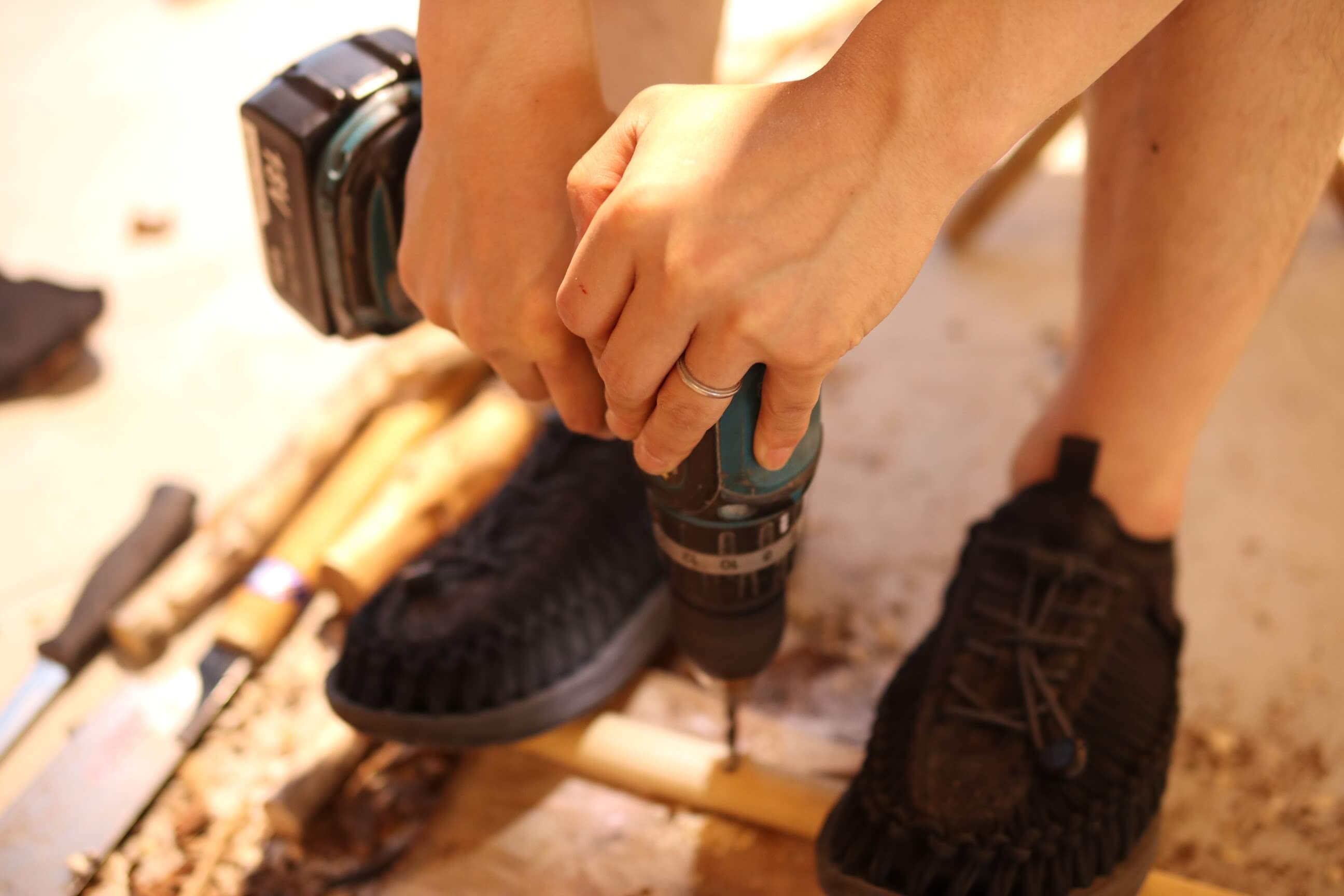 ドリルネジを使って丸棒の先端、真ん中に固定していきます。写真ではすでに丸棒の真ん中に穴が空いていますが、ドリルネジとインパクトドライバーを使えばあらかじめ穴を空けておく必要はありません。
