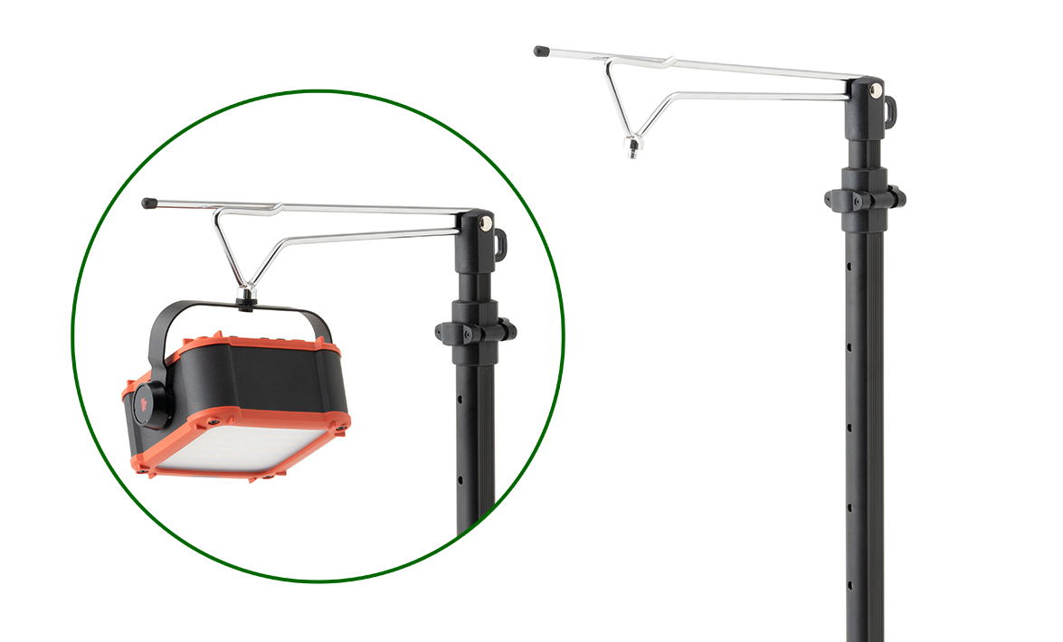 同社のパワーストックランタン(ロゴス史上最輝のランタン)に対応する付属の専用ネジを使えば、角度調整も可能。また、付属ペグを使って脚を地面に固定することで転倒を防止できる。
