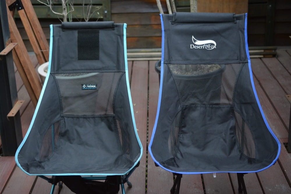 Amazonで2,999円という破格で売られている、DesertFox アウトドアチェア(右)。名作ハイバックチェアであるヘリノックス チェアツー(左)をオマージュした製品です。