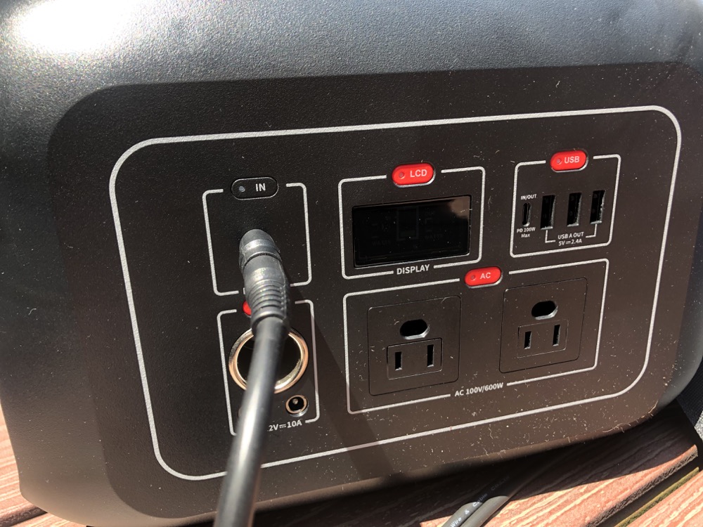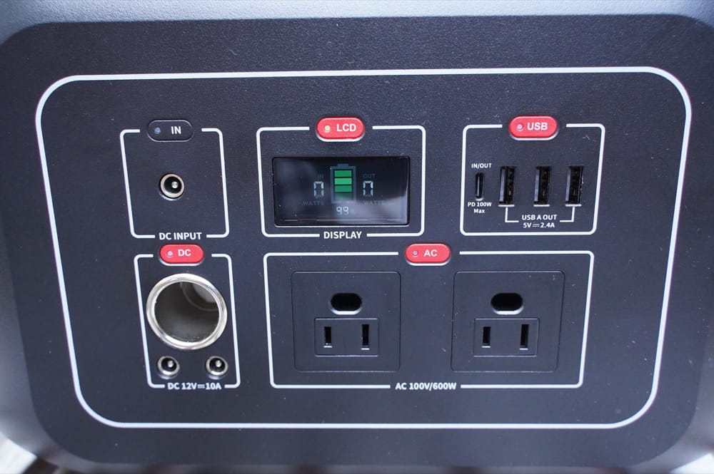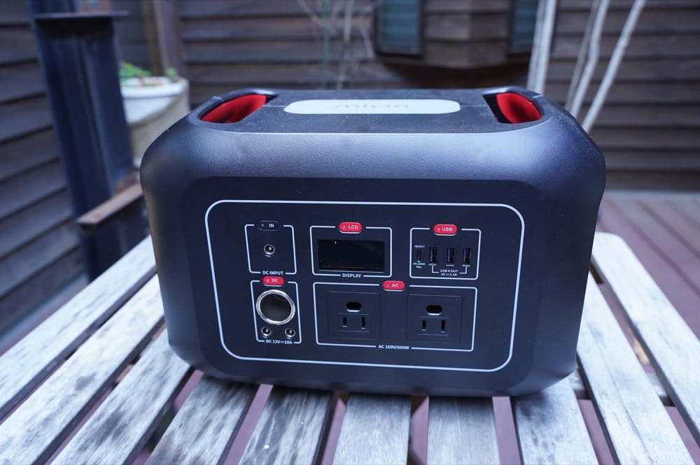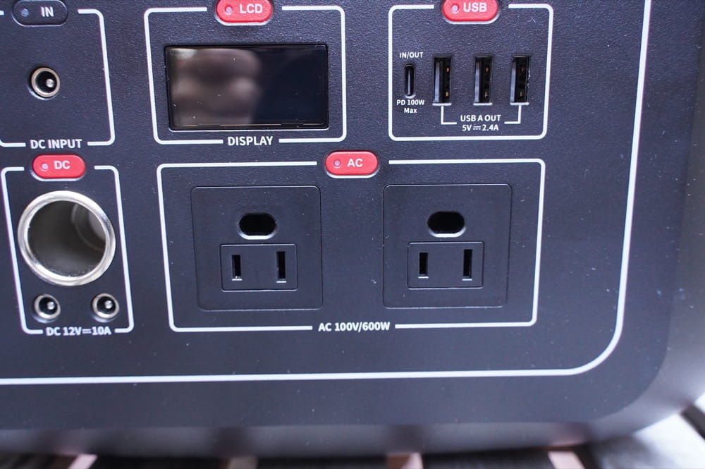 以前レビューさせていただいた他社のポータブルバッテリーについても、AC出力の最大ワット数が600Wとなっていました。近年の高性能なポータブル電源における、AC電源出力の上限値のいわば「基準値」と言ったところでしょうか。