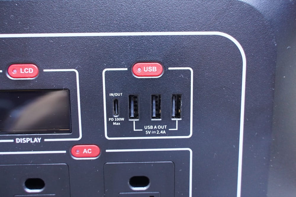 - 充電用端子(INPUT)、LCD液晶パネル、USB-Cポート1口、USB-Aポート3口
