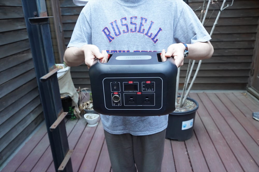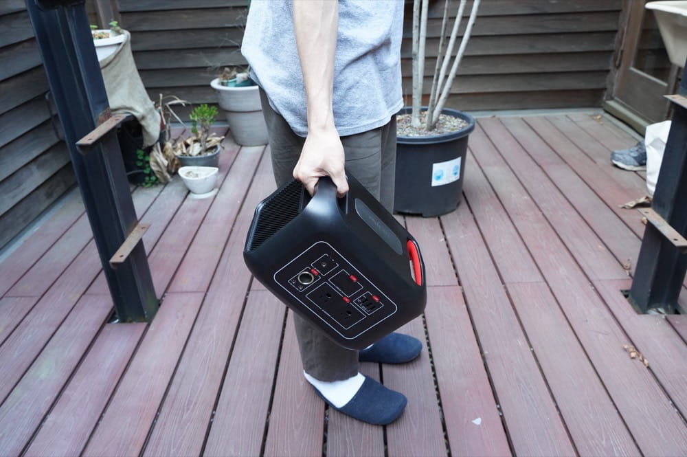 さすがに100,000mAクラスのポータブル電源より重さはあります(約6.5kg)が、持ち運びは楽ですね。