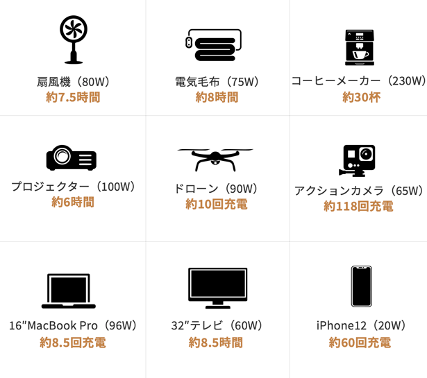 600Wまでで使用できる電子機器と時間の例は下記の画像になります。