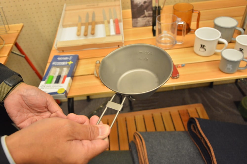 こちらはハイマウントオリジナルのコーヒープロダクツで、注ぎ口のついたチタン製シェラカップ 。コーヒーを沸かしたあと、スマートに注ぐ為の意匠です。