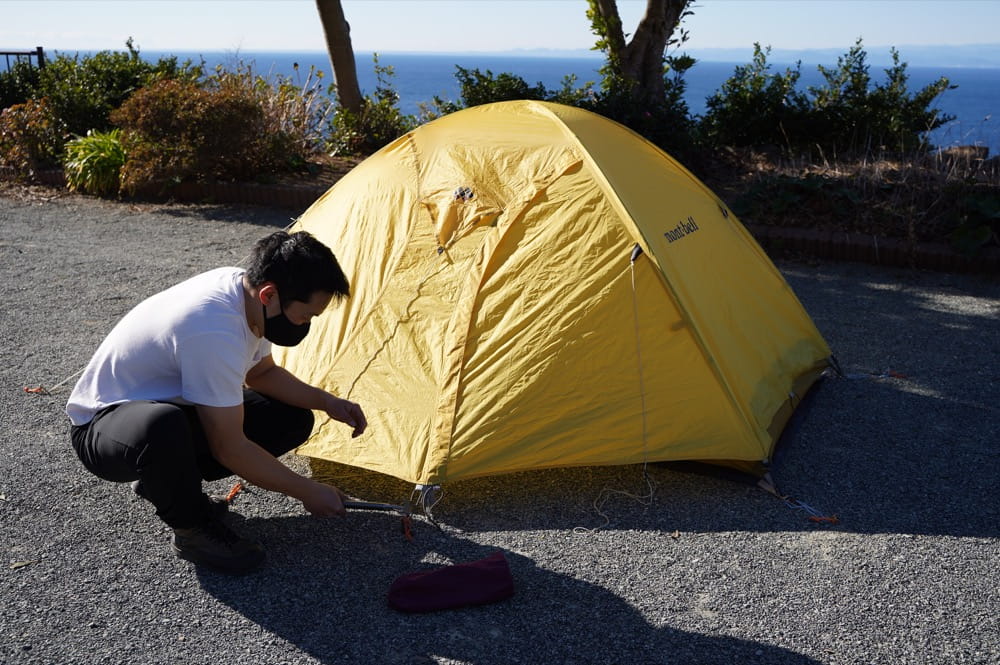その後、フライシートを被せてペグダウンするだけ。慣れれば10分程度で設営可能です。