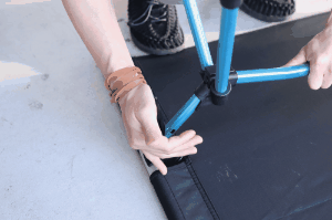 コット本体への組み立ても直感的で分かりやすい。黒い金具をパチンと留めるだけの簡単オペレーションです。この金具のおかげで、力がなくても組み立て可能です。
