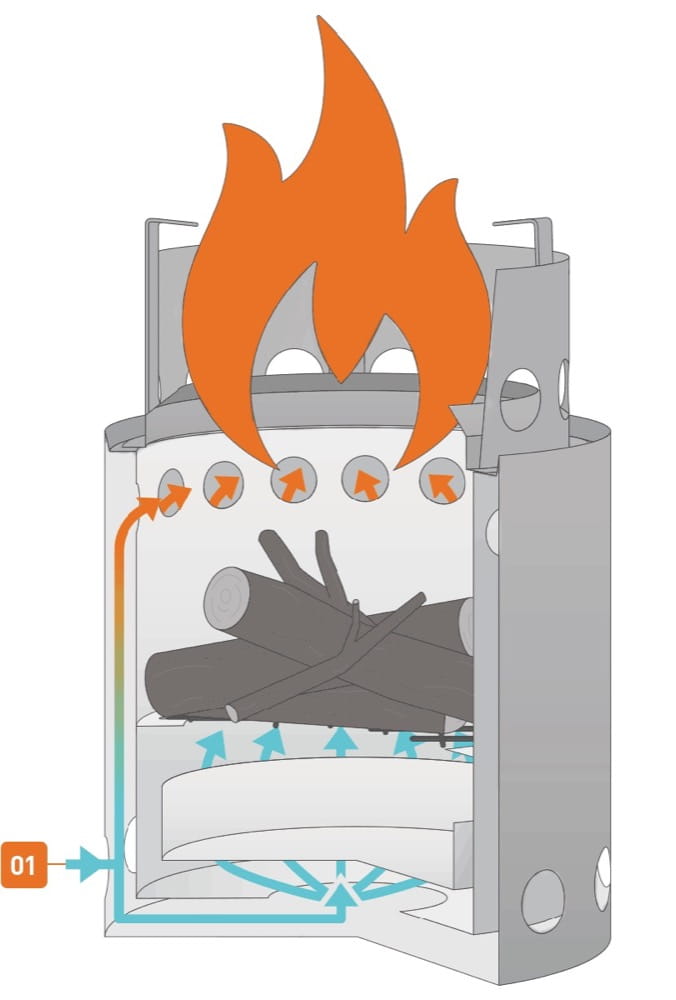 よくできた二次燃焼焚き火台は、未燃焼ガスへ向けて効率よく二次空気を排気します。