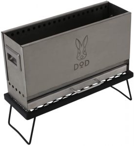 DODのめちゃもえファイヤー。市販の薪をくべやすい横長形状。二次燃焼が視覚的に分かるため楽しむことができます。
