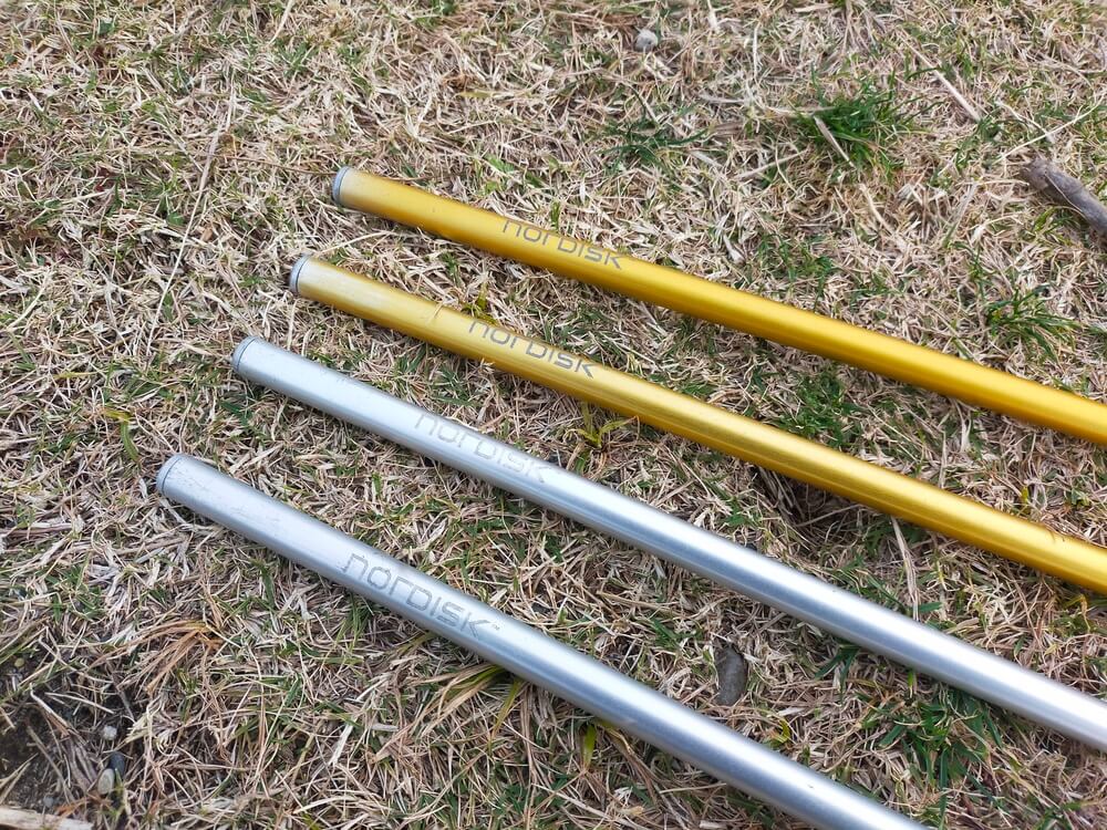 ポールは全部で4本。折りたたまれている状態のポールを連結して伸ばしましょう。一本一本がかなり長いので、込み合ったテントサイトでは、お隣さんのサイトに入らないようにご注意ください。