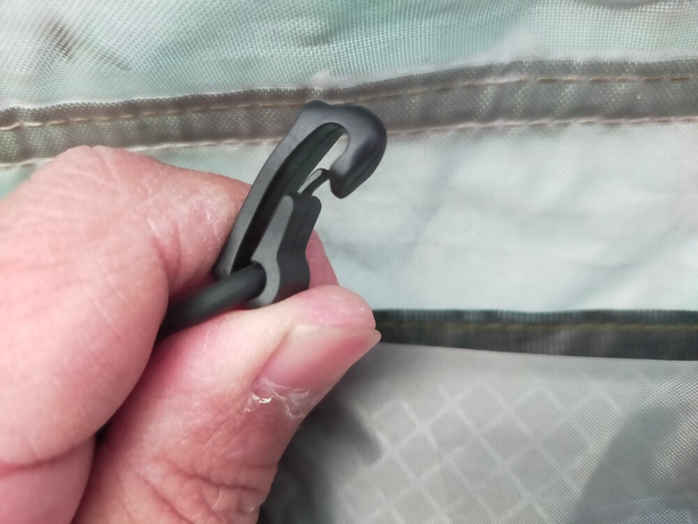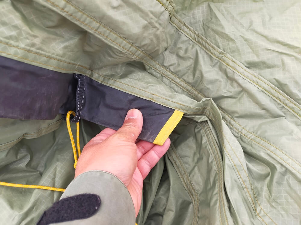 キャノピー用のガイラインはリフレクターが織り込まれたタイプで、夜間の視認性にも配慮がなされています。カラーもグリーンと相性のいいイエローです。同じ素材のガイラインが、防風用としてあらかじめ本体にセットされています。