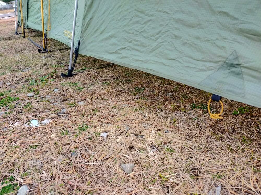 インナーテントを取り付けたら、ポールの両端をペグダウンします。風が吹く日には、必ずポールの破損を防ぐ、ストームガードのガイラインもペグダウンしましょう。