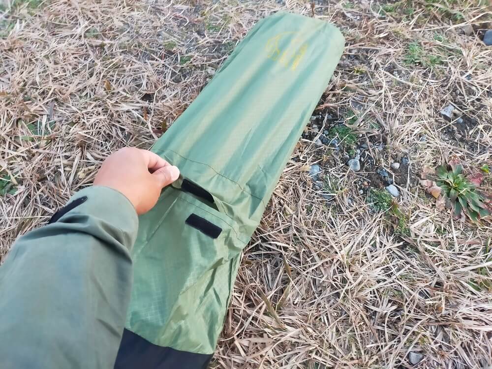 上の写真はポールケースです。フロントにマジックテープで開閉できる小物入れがついており、ペグやガイラインを収納できるので便利です。