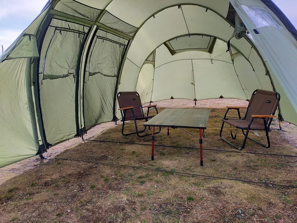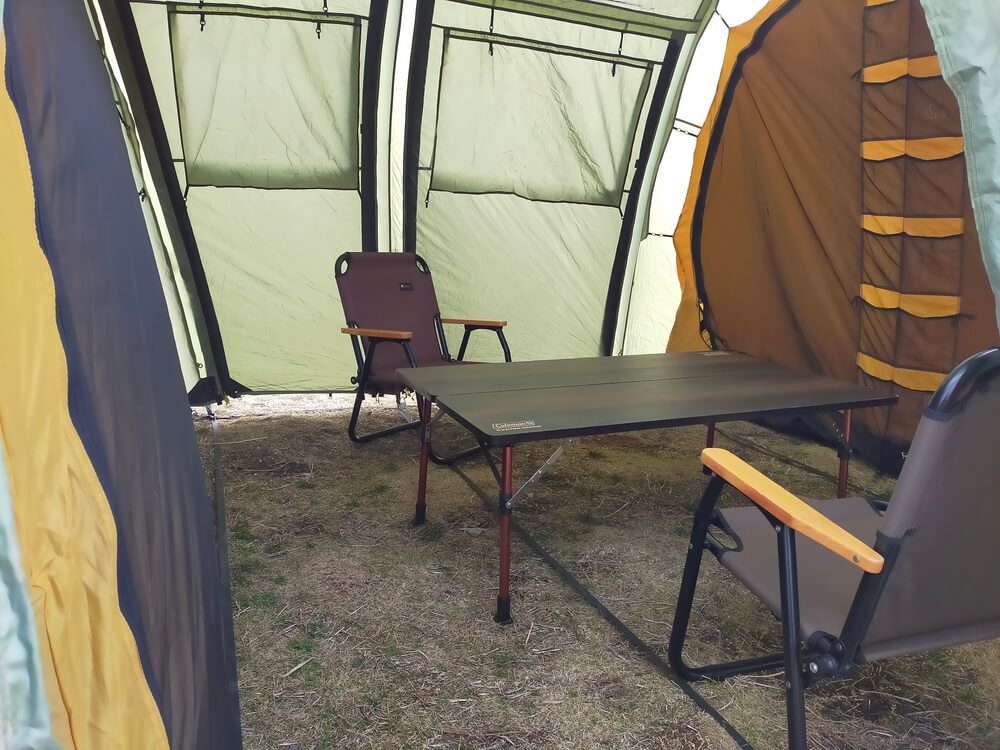 インナーテントの大と小を両方とりつけても、椅子4つと机1つが入るほどのスペースがあります。