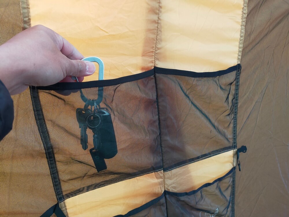 インナーテント大の外側には12カ所に分かれた収納があります。著者は、車の鍵、子供のおもちゃ、お菓子類などの小さいものを仕分けておくのに使用しています。