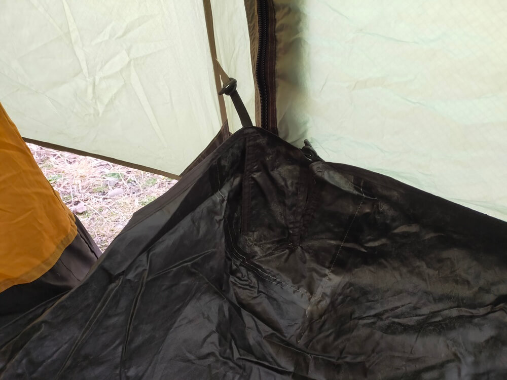 レイサ6には下部にスカートがありません。スカートが無いので通気性が良く、春~秋にかけてのキャンプには快適ですが、冬場に強風が吹く場所でのキャンプはおすすめできません。