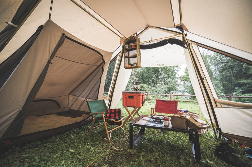別売りのT/C素材インナーテント(2人用)を左右それぞれに貼ることが可能。1つならデュオキャンプに向いた居住空間、2つなら4人まで対応するためファミリーテントとしても使えます。