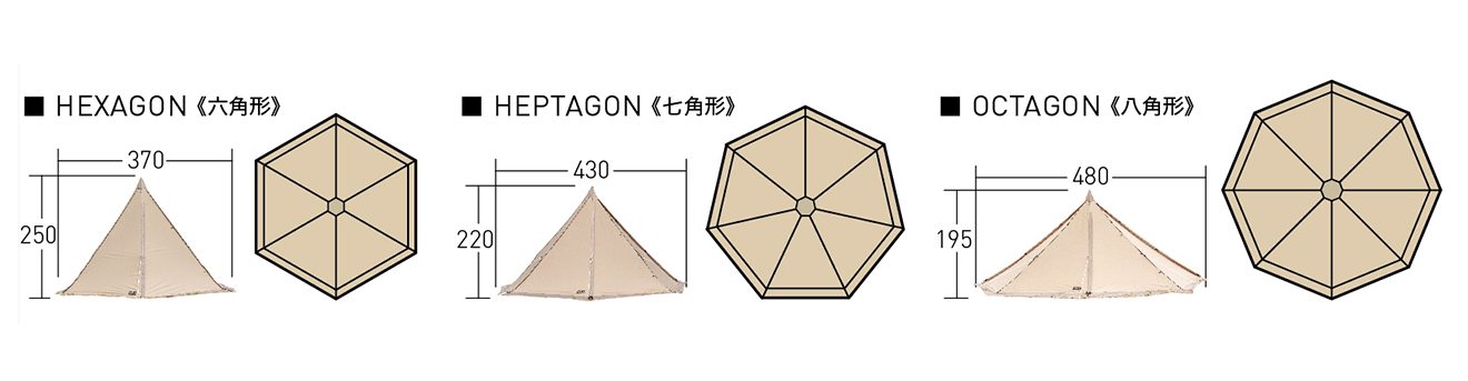 ポールの長さを調整し、本体側部のファスナーを開閉することで6角形、7角形、8角形と変形自在なテントです。