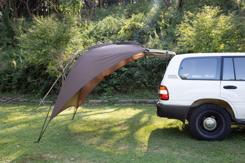 名作のカーサイドリビングがサンドベージュカラーでリニューアル。車中泊派にもぴったりな高機能カーサイドタープです。