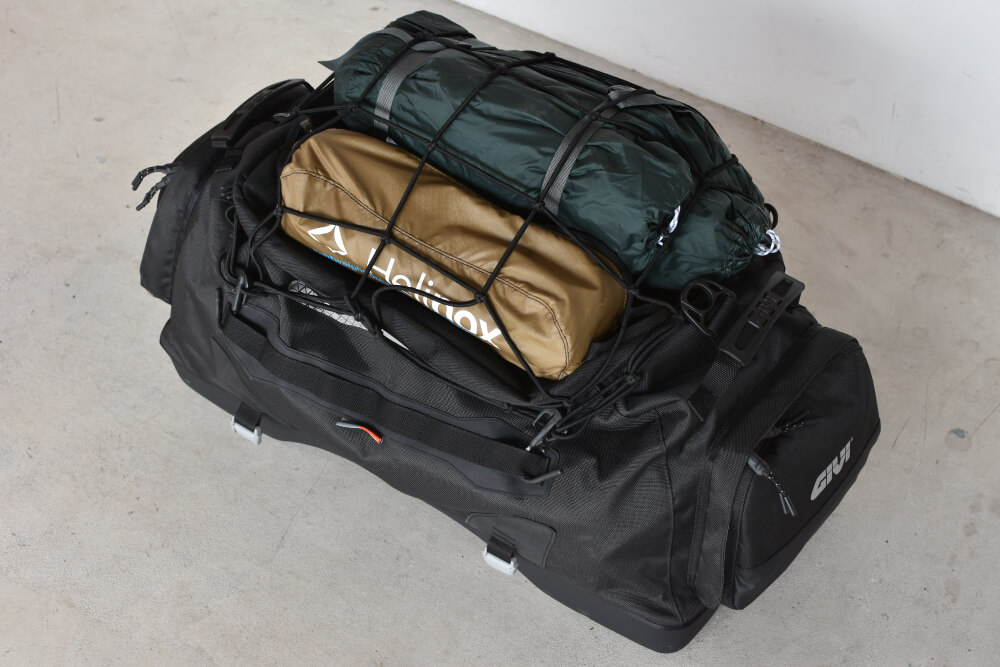 今回はGIVIのシートバッグ「UT806」を使って積載しました。バッグが大きいこともあって他のギアと一緒に余裕で収まるサイズ感です。