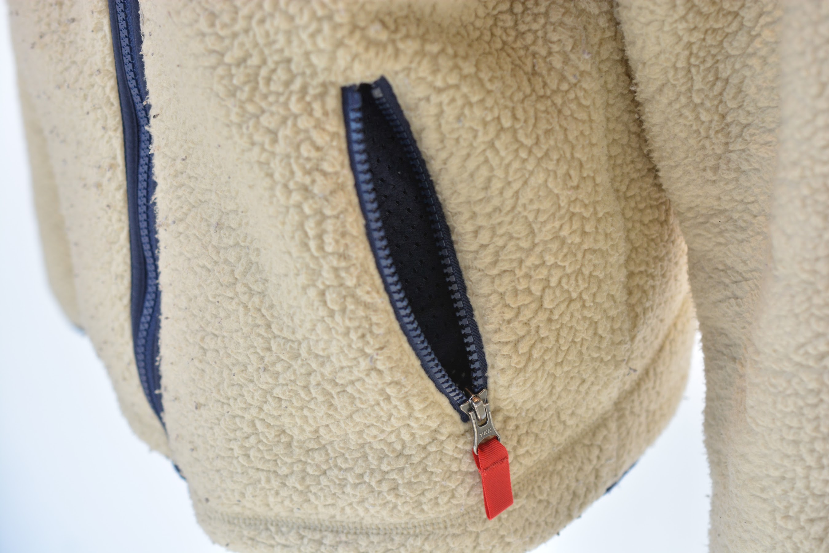 ジップ部分はYKK製のタフネスなもの。ファスナー部分のブロック(エレメント[務歯]と呼ぶそう)がやや大きめのタイプで、壊れにくいです。