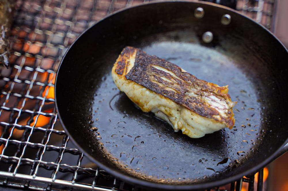 スキレットにオリーブオイルを大さじ1杯入れ皮面からじっくり火を入れていきます。