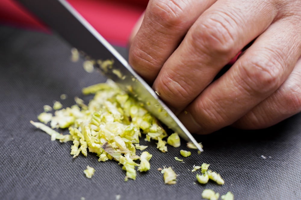 ①スキレットにオリーブオイル30g(大さじ2杯ほど)を入れて、その中にみじん切りしたふきのとうを入れ炒めはじめます。