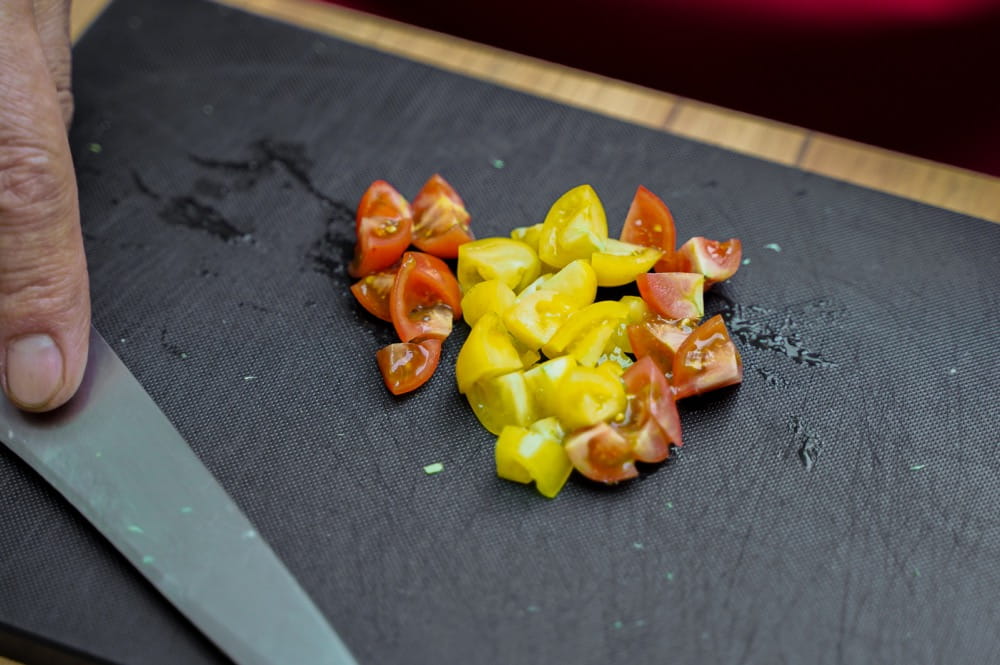 ②次に1センチ角にカットしたプチぷよトマトを入れます。