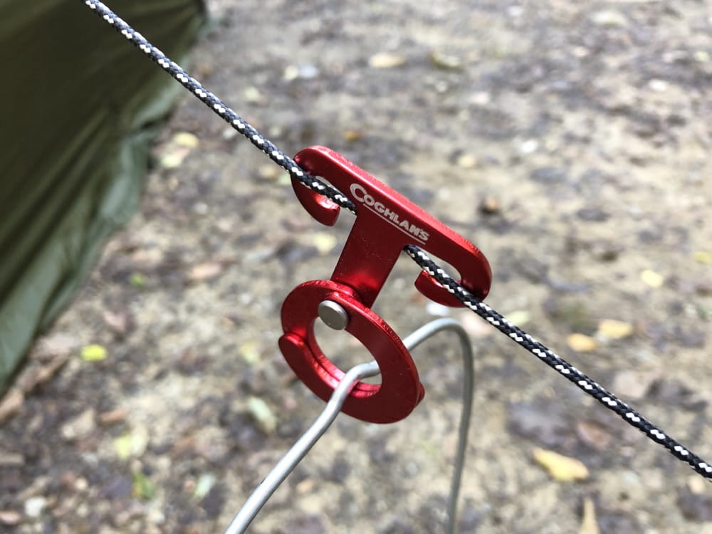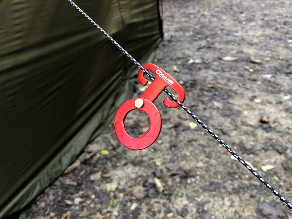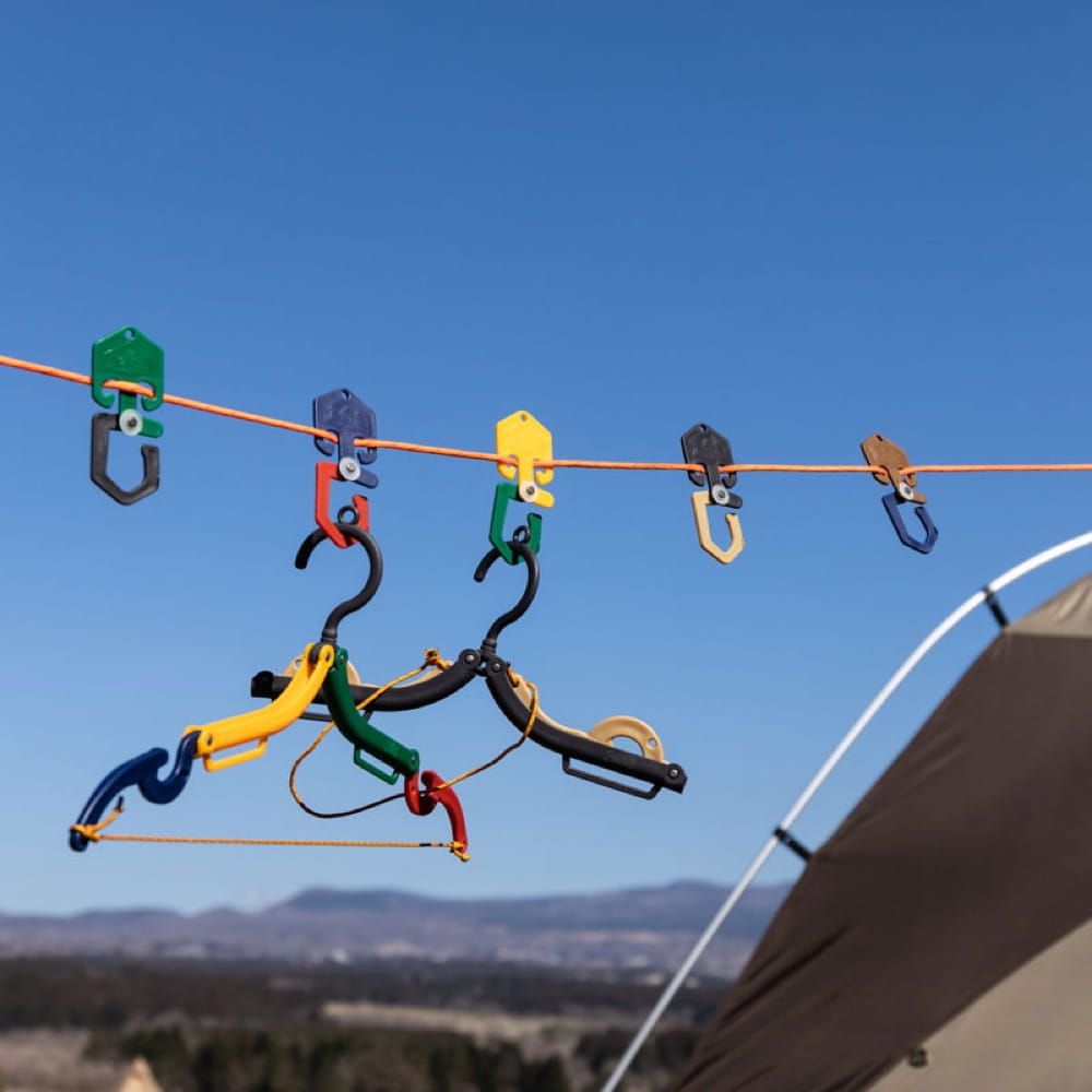 ガイロープに引っかけて使ってもらうフックで、脱いだ上着やはたまたシェラカップなど様々なものかけてサイト内をすっきりさせましょう。