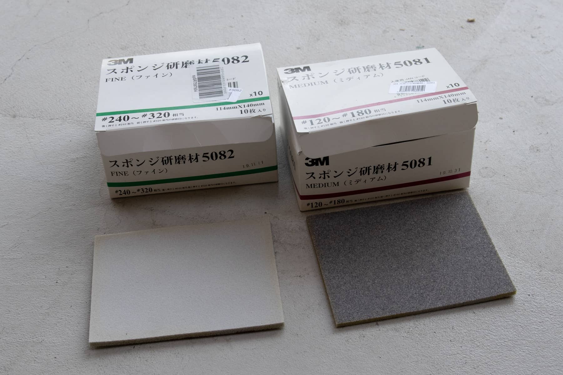 以前購入した3Mのスポンジ研磨剤 MEDIUM(#120-180相当)と FINE(#240-320相当)を使用。