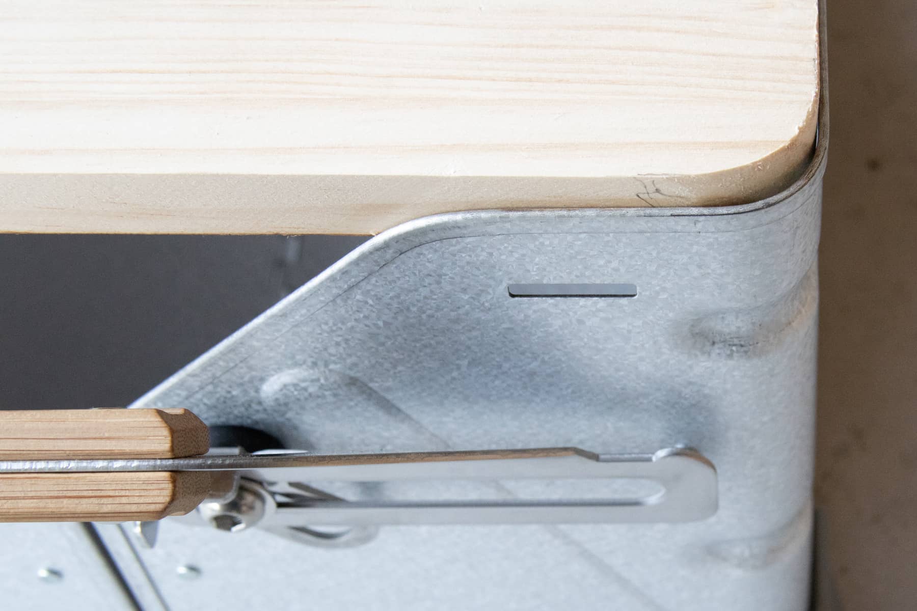 シェルコンを開いている時は、上写真の赤い部分の厚さの分だけシェルコン内寸の長辺が1m程短くなるので、開いた状態でも天板を載せてサイズを確認してみます。サイズが合わない場合は木工ヤスリで頑張って削るか、諦めて新しい材料を用意してやり直します。