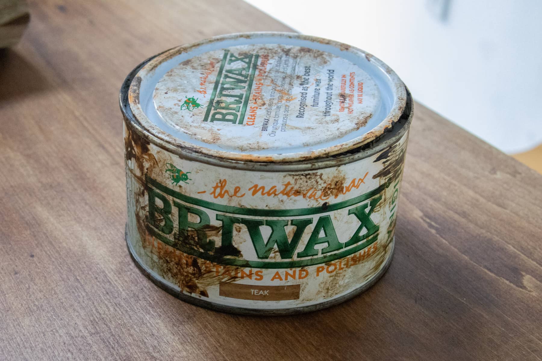お好みの塗料で塗装します。今回はブライワックスのTEAKを使用しました。塗装前に全体を3Mのスポンジ研磨剤 FINE(#240-320相当)で軽く研磨しました。