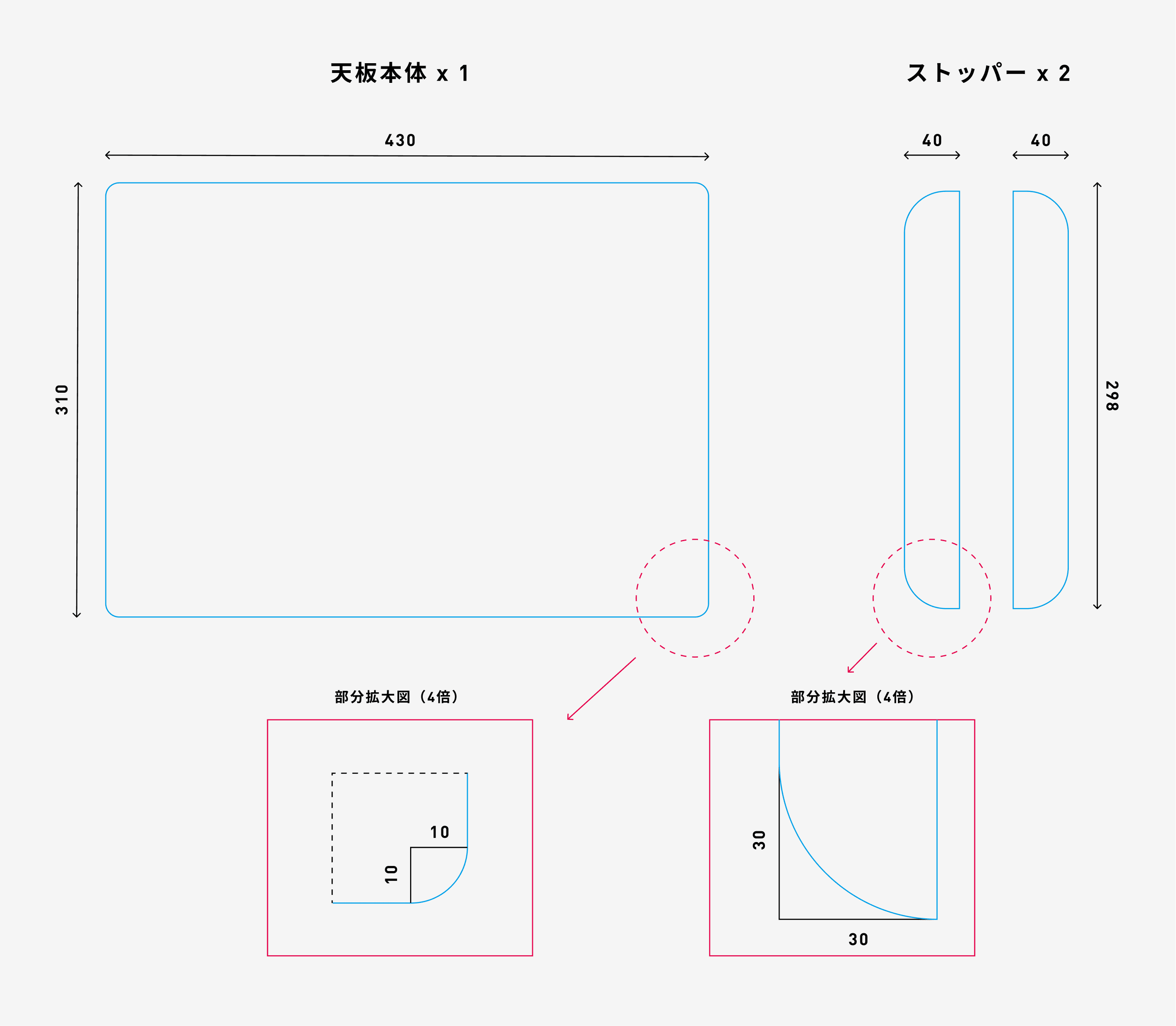 - 310mm x 40mm 2枚(実際に使用するストッパー用の板の寸法は298mm x 40mm)