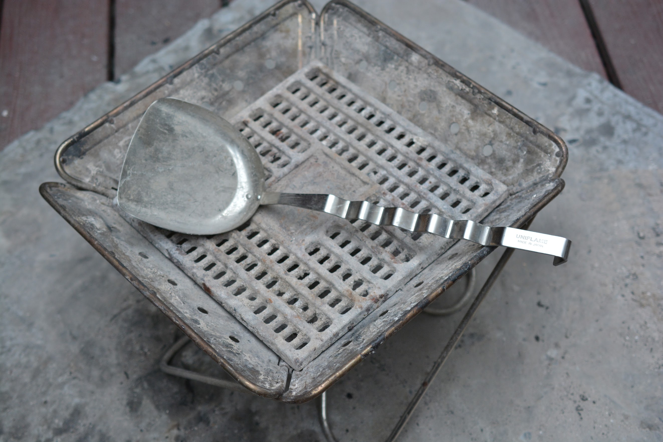 焚き火が終わった後の灰の処理用に、ユニフレーム(UNIFLAME) シャベル ウェ~ブ 炭スコップを使っています。