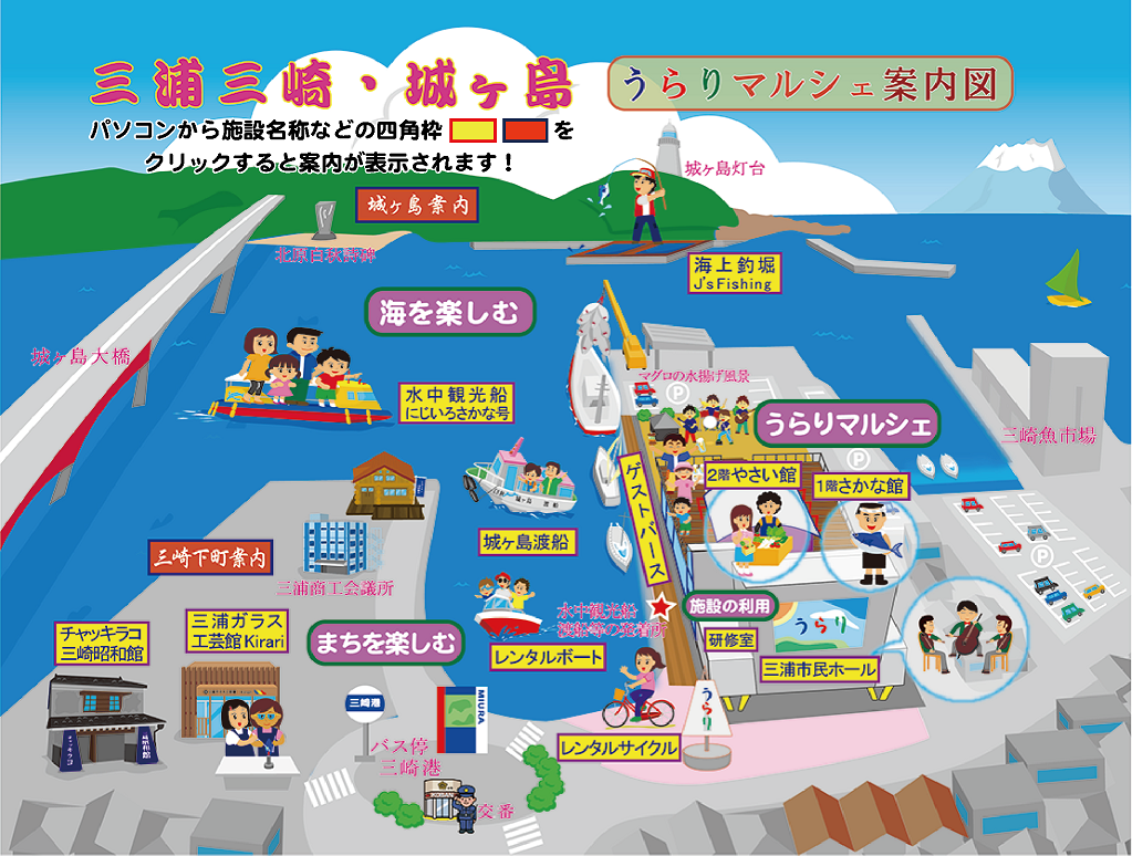 三浦半島の先端に城ケ島がありますが、島を渡らないところに”うらり”という直産市場があります。魚と野菜はここで買うのがいいです。三浦はマグロも有名ですし、季節にちなんだ新鮮な魚介が購入できます。しかもこの”うらり”は水中観光船(船の下に窓があって海の中を見れるやつ)や海上釣り堀(マダイやシマアジなどが釣れる)も運営しているんです。