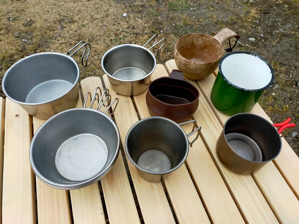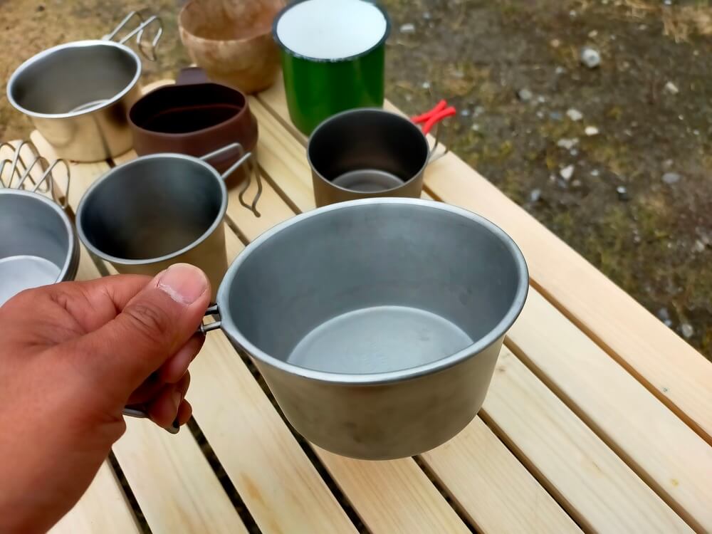具体的には金属製のボウルやシェラカップなどがおすすめです。食器を焚き火調理に使用すると、すすで真っ黒になるので、黒くなっても気にならない、無骨なデザインの食器を選びましょう。