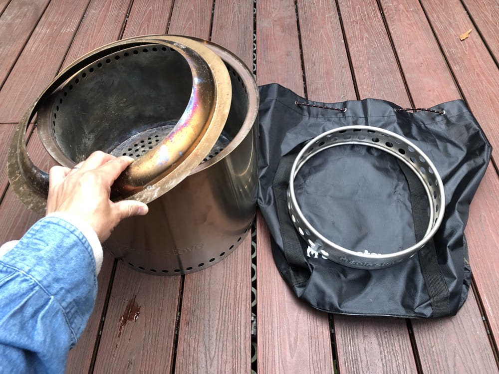 本体に乗っている輪っか形状のパーツは「ファイヤーリング」。使用時は横から見て凸型になるように本体に設置し、収納時は逆さまにします。