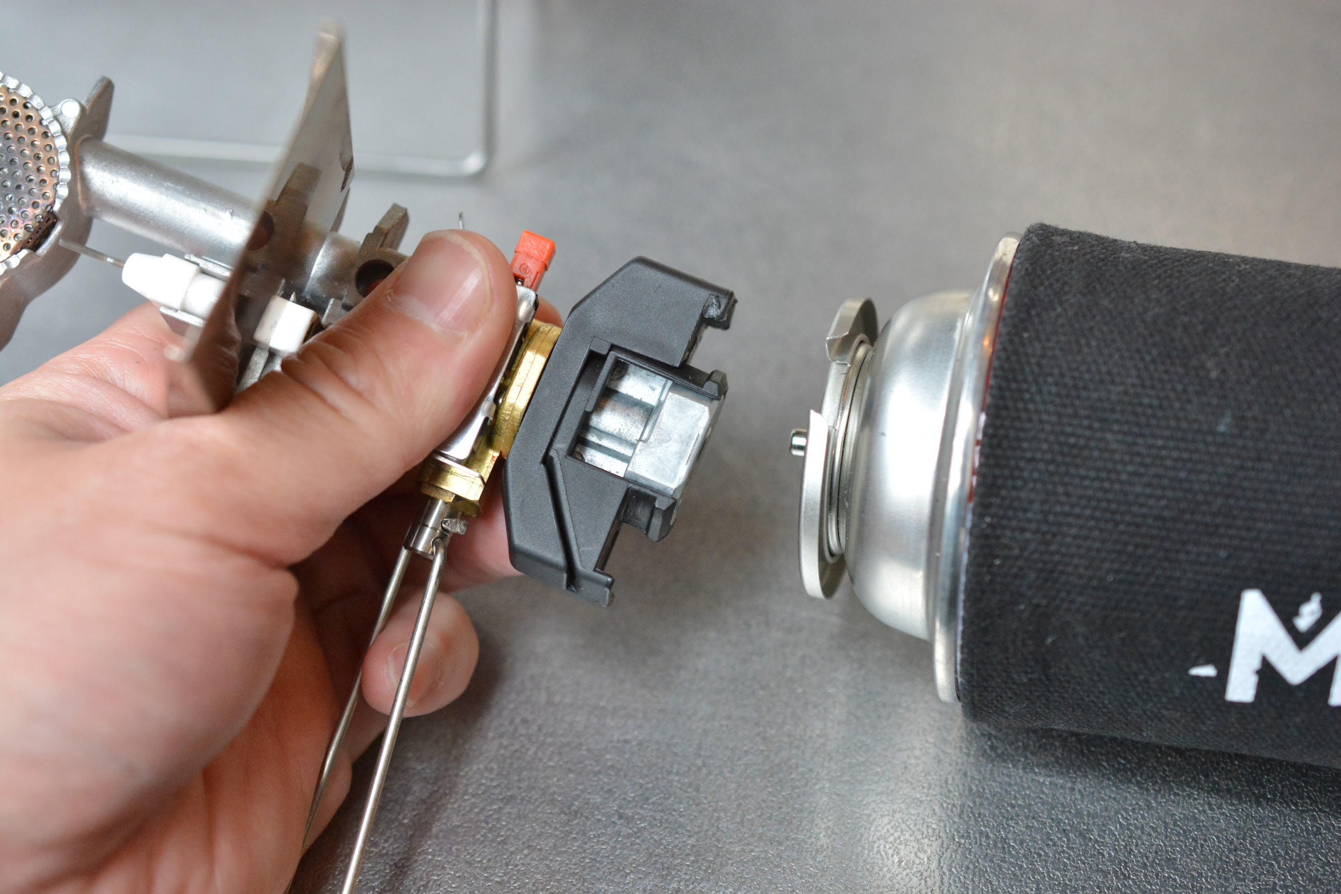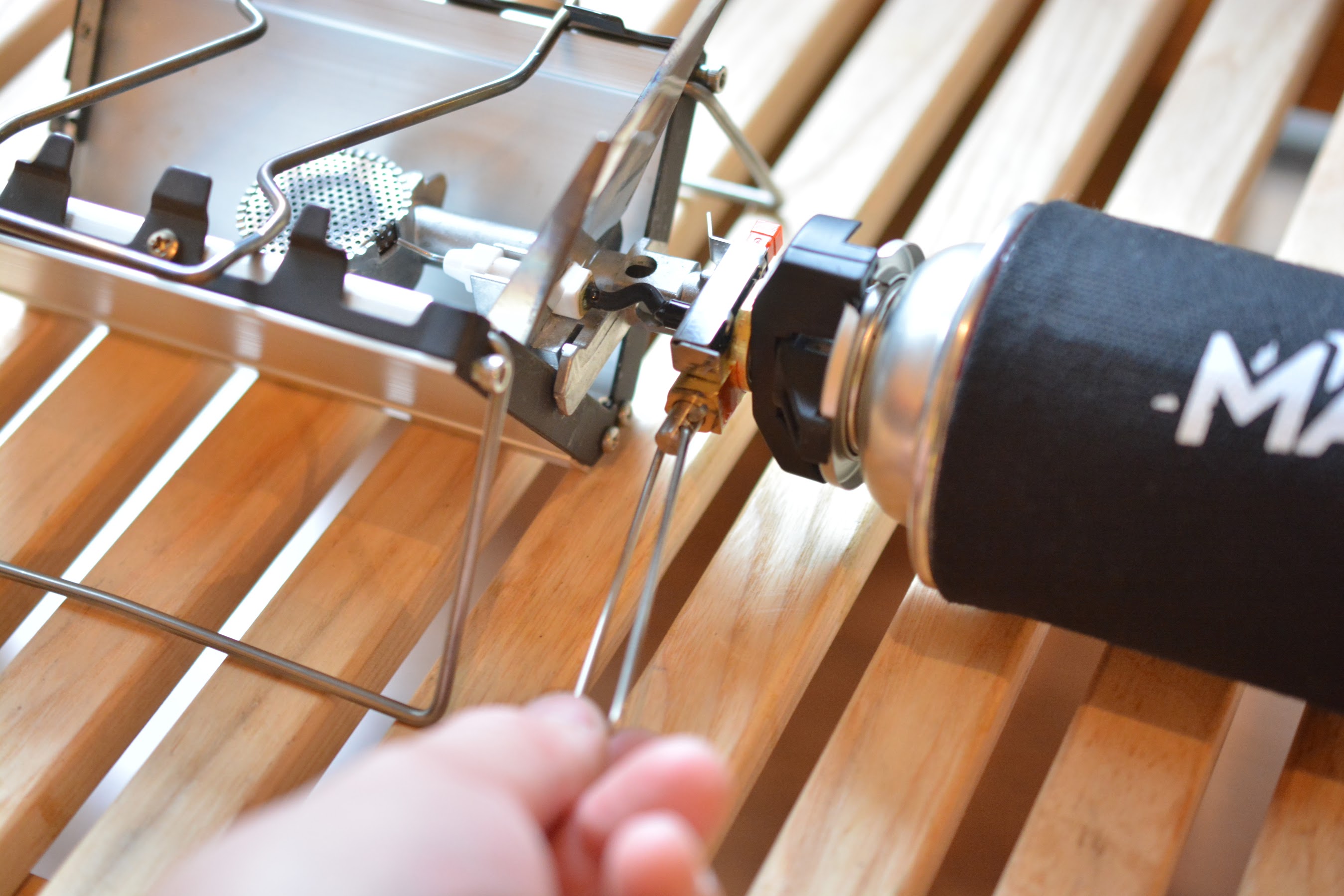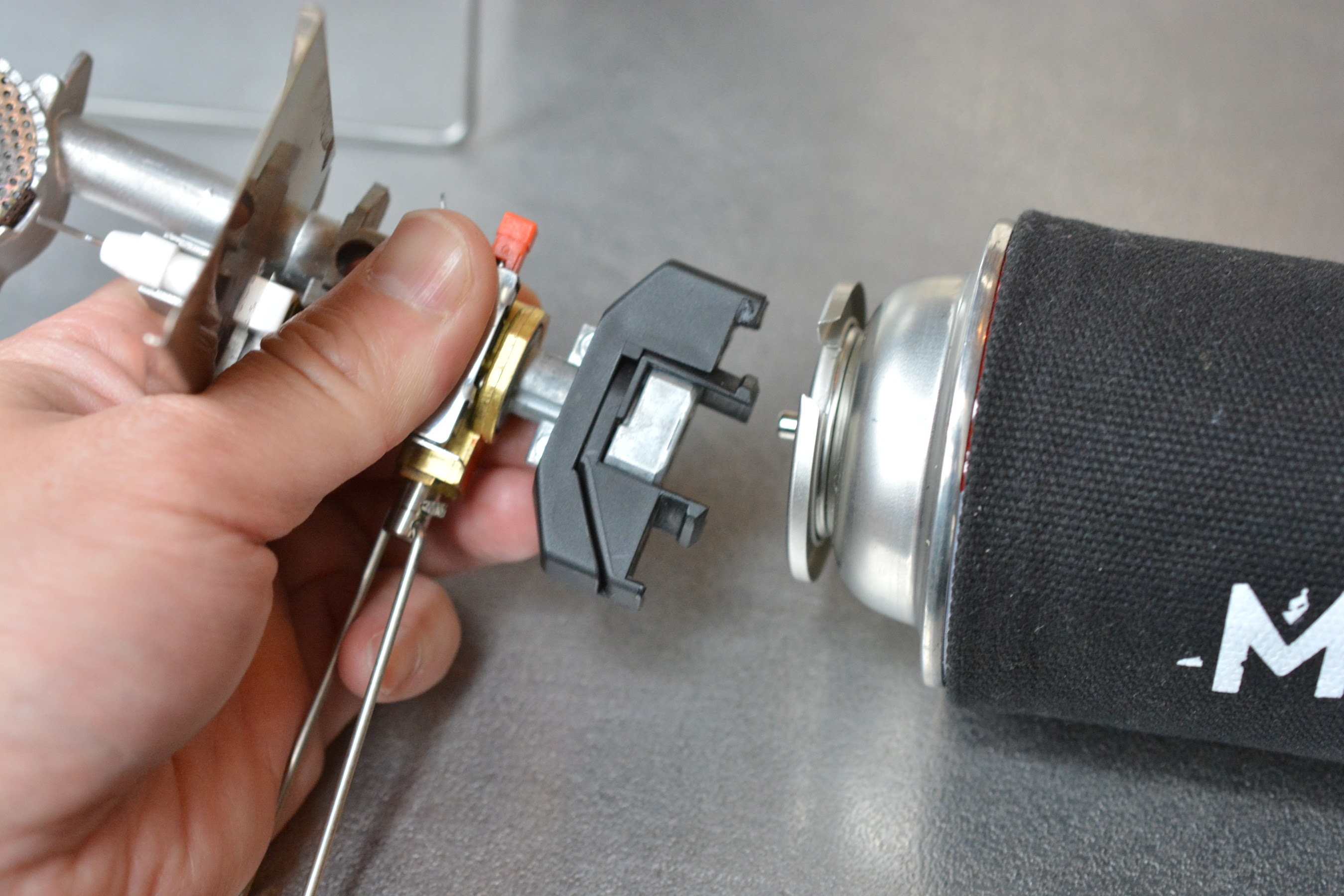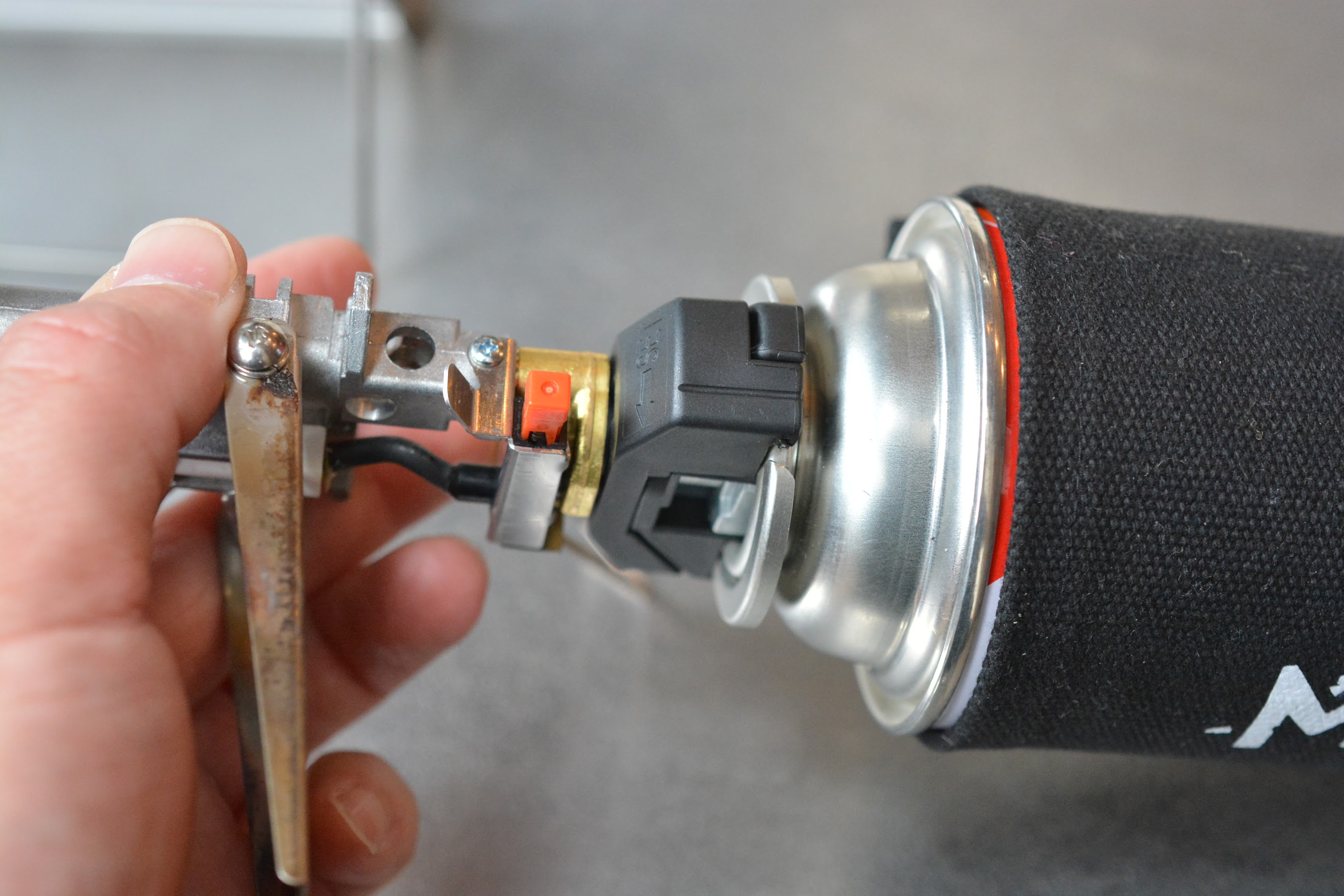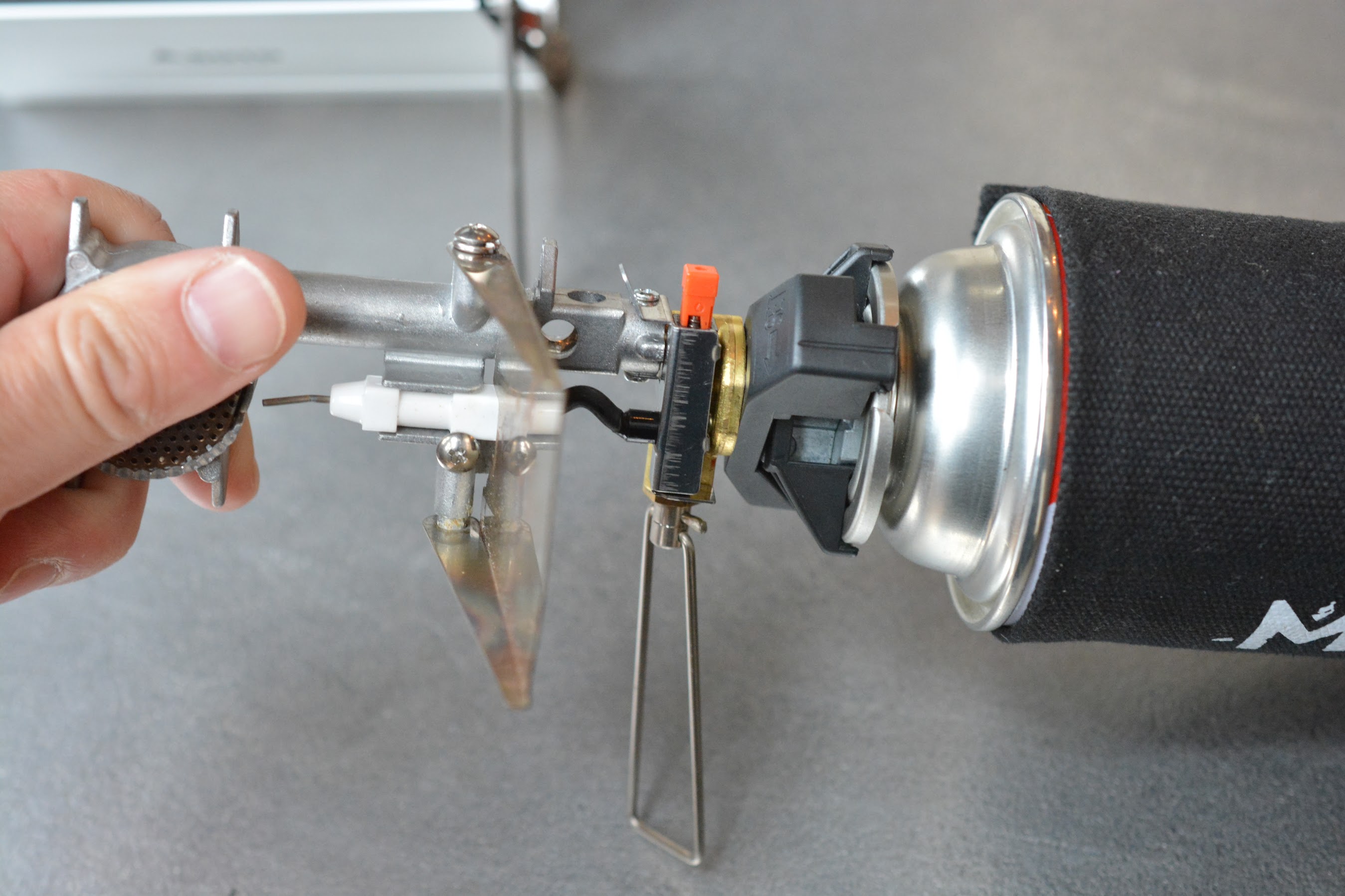 バーナー本体をグッとガス缶の方向へ押し込みます。