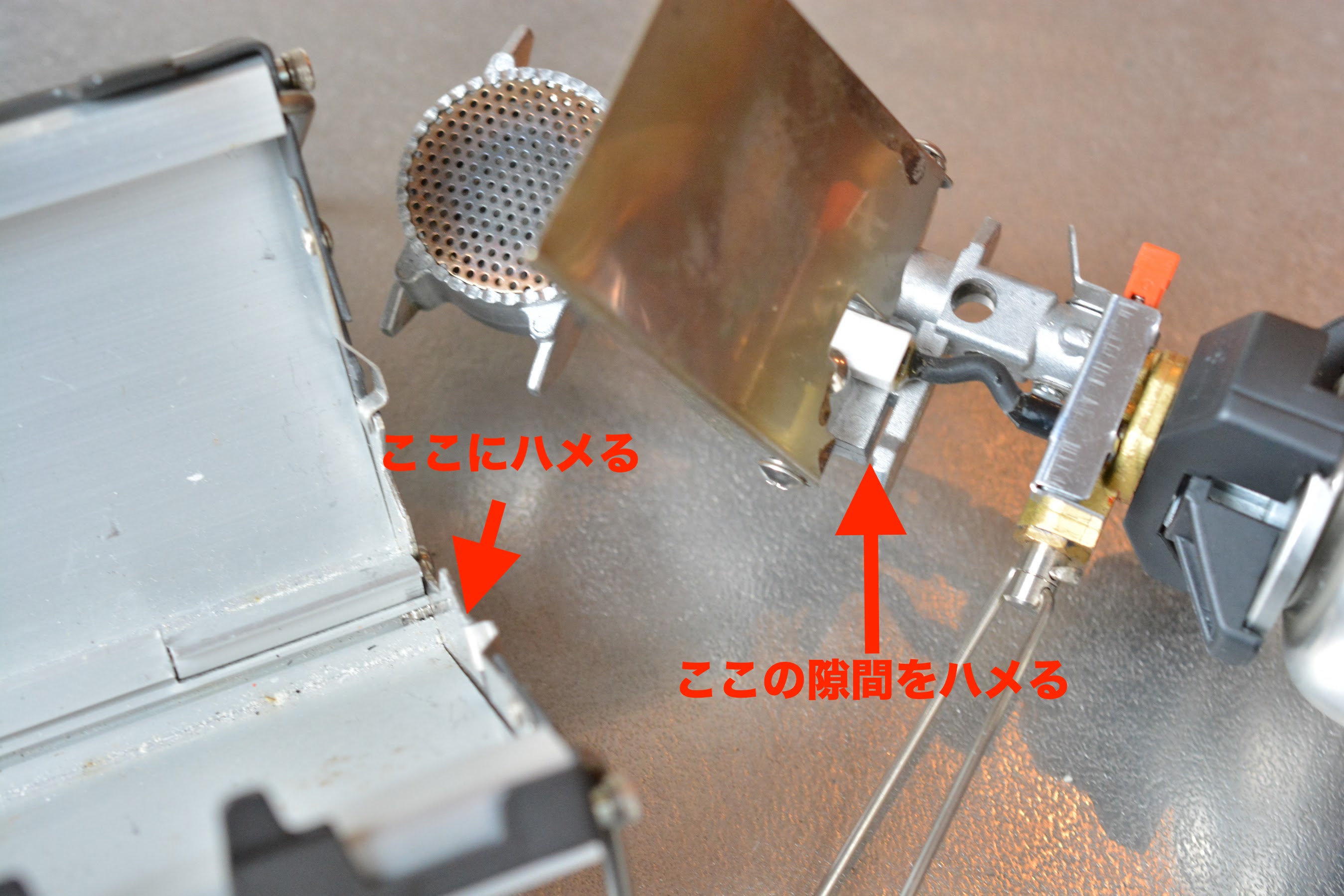 スタンドとバーナーのはめ方です。バーナーにある隙間を、スタンドのエッジにはめ込みます。
