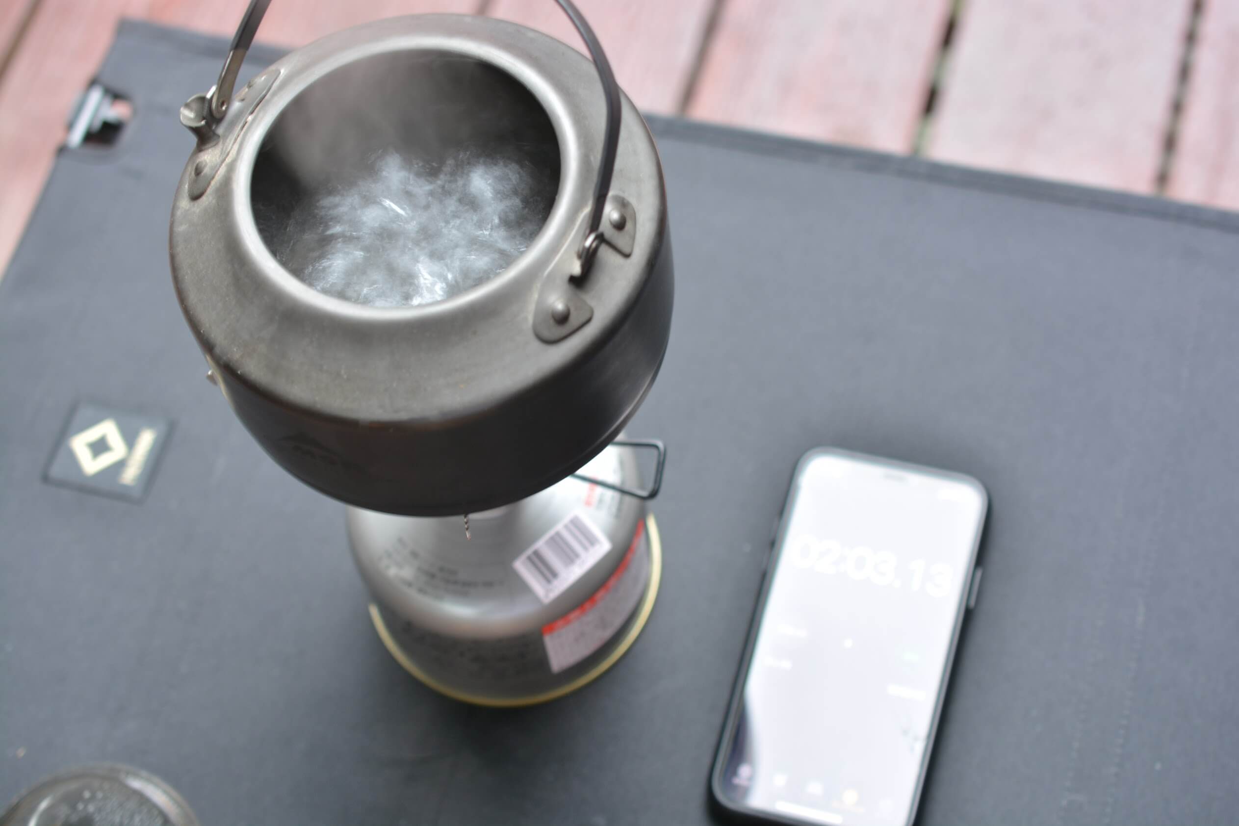 水道水を500mml用意し、完全に沸騰するまでの時間を計測。気温は12度、湿度79%。ガスの出力つまみをMAXまで調整し点火。