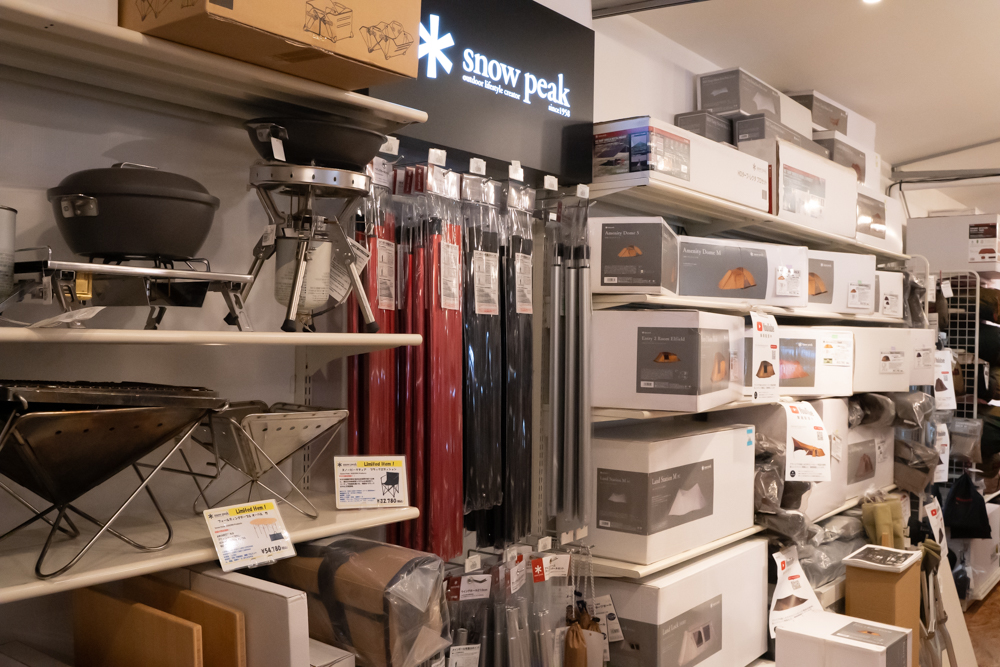 店員さんのうち、2名の方がスノーピークマイスター(スノーピーク公認の販売員)ということで、スノーピーク製品も豊富にラインナップ。
