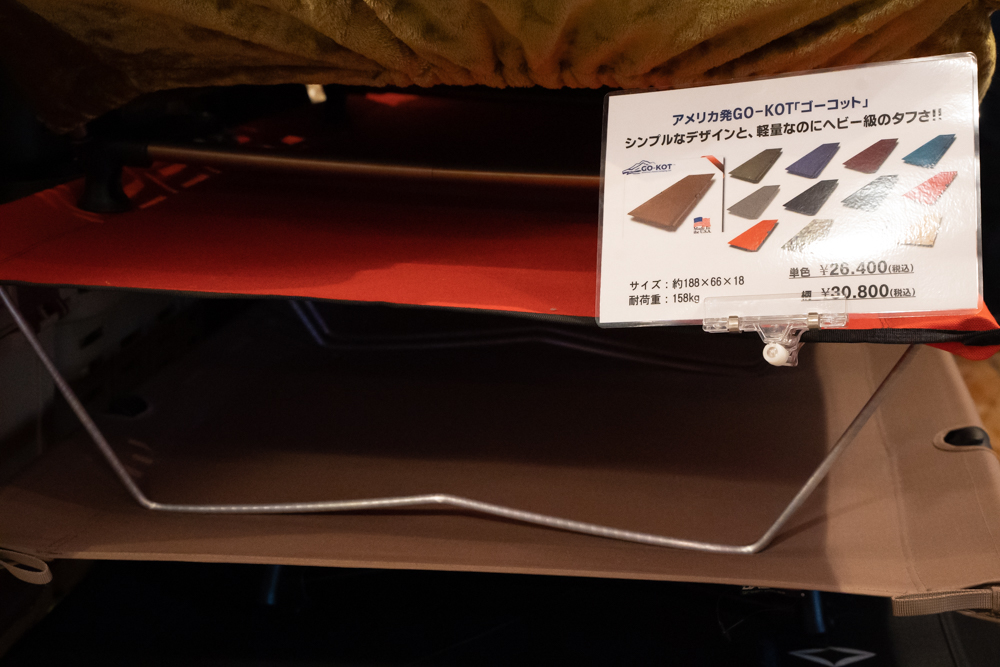 他のアウトドアショップではなかなか見かけないアメリカ製コット「GO-KOT」。