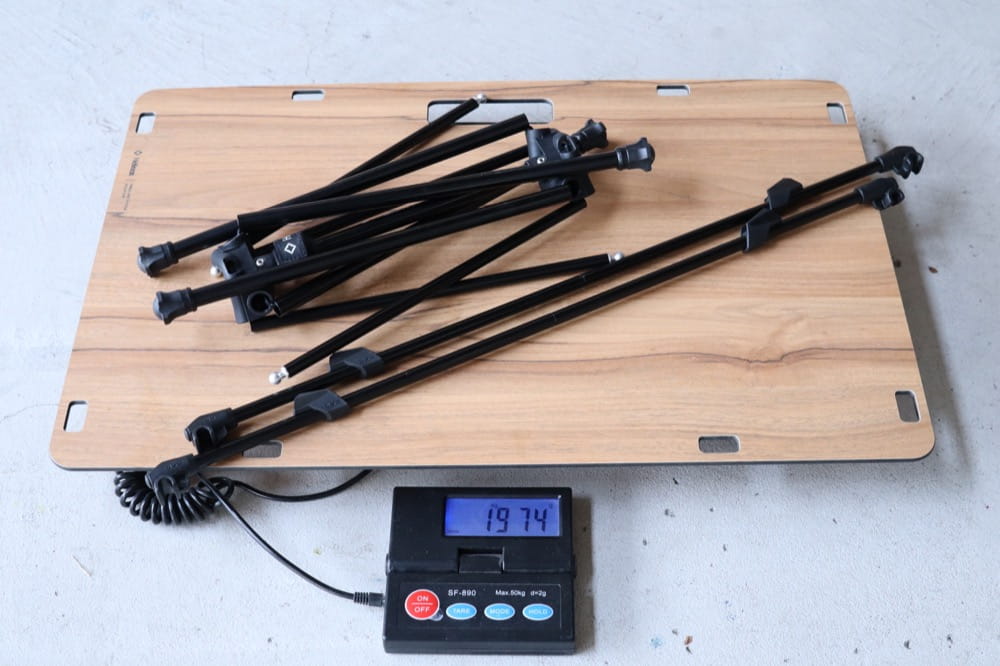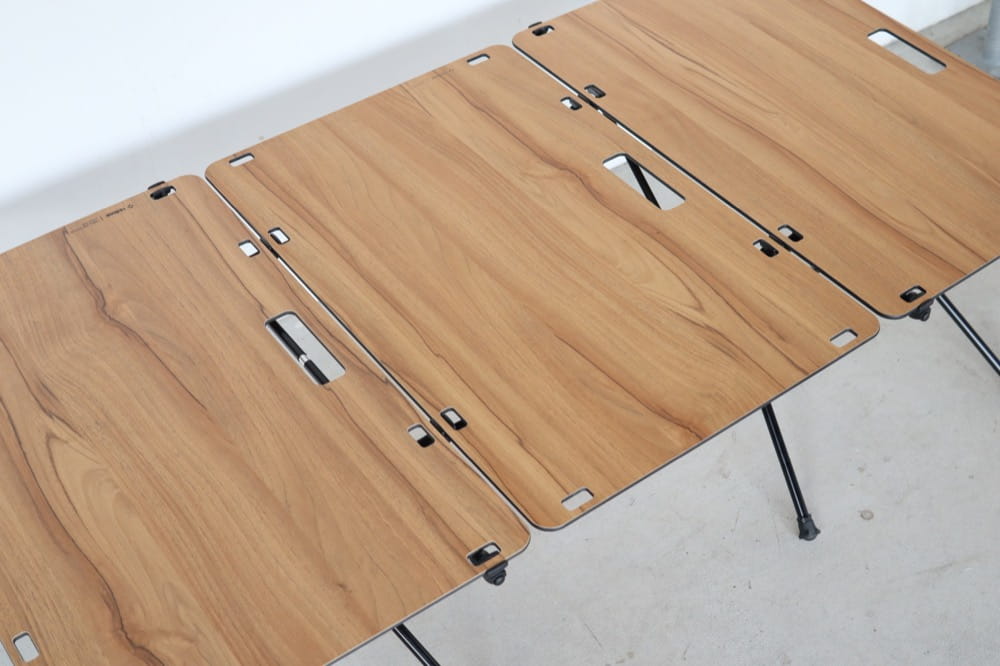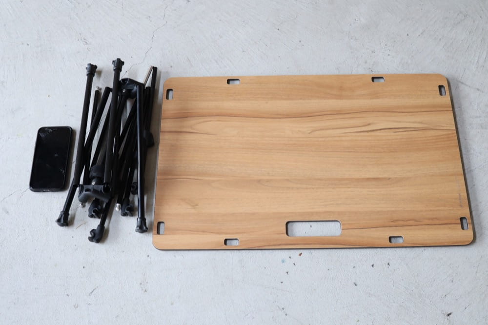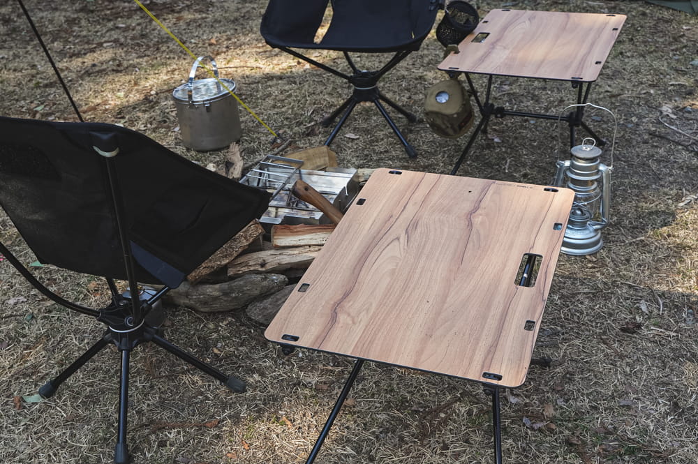 また、布製天板に比べて火の粉に対する耐性が強くなるので、焚き火用サイドテーブルにも向いています。