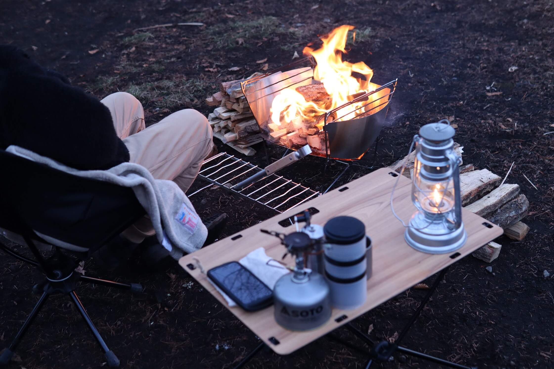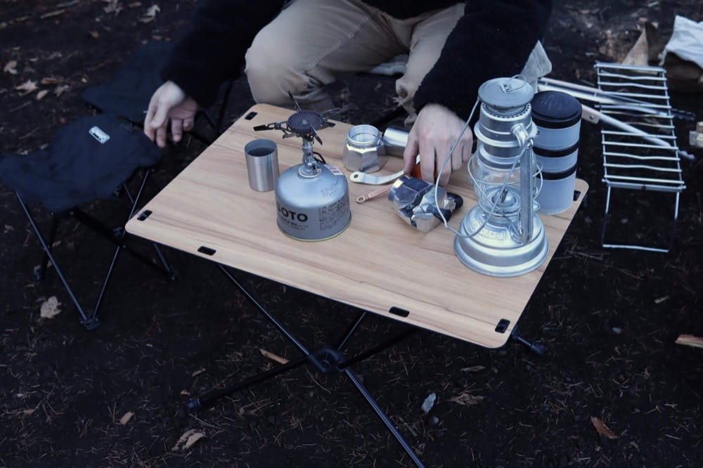 個人的な使用用途としては「焚き火用サイドテーブル」として使用することが多いです。クッカーやガスランタン、その他焚き火関連のツールなどを置いています。