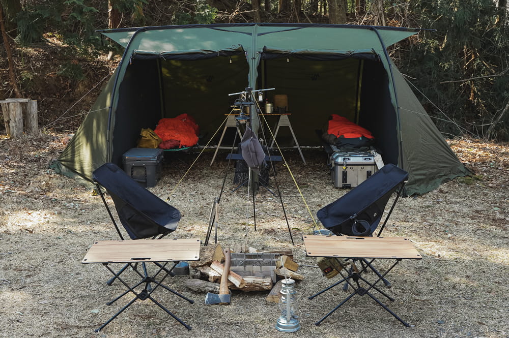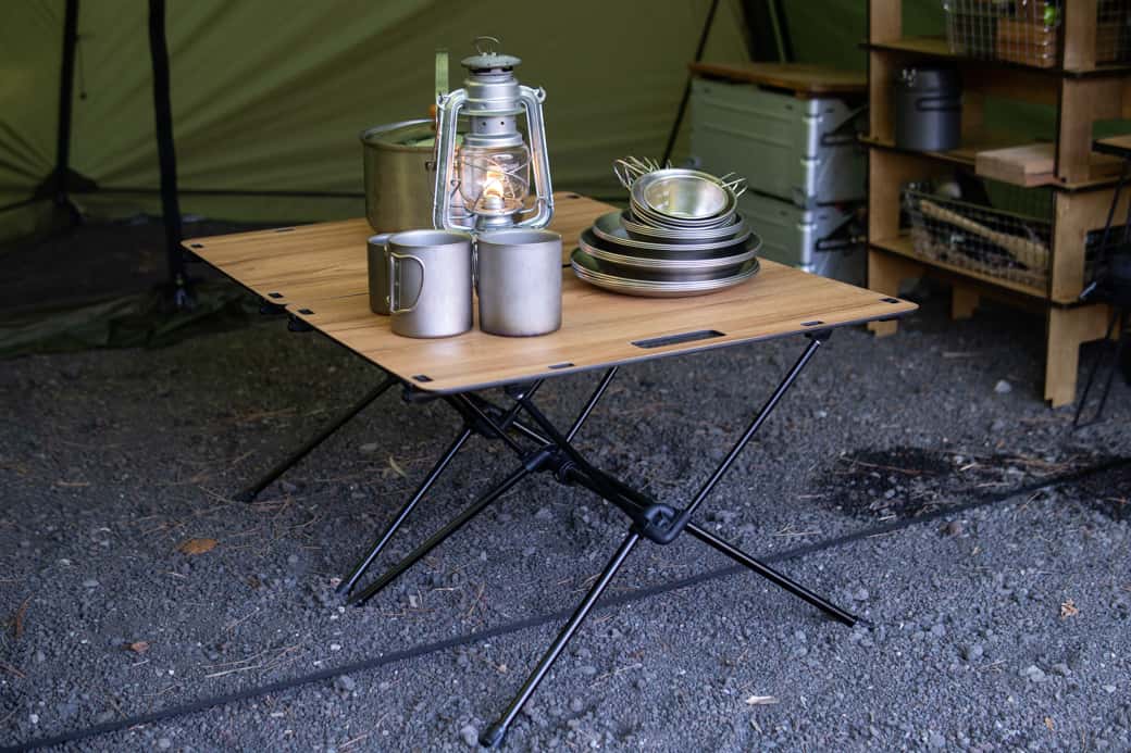 一方でソロキャンプ、キャンプツーリングなどはタクティカルテーブル M。折りたたみ可能な布製天板で持ち運びしやすいからです。