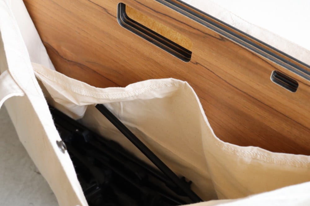 内部は天板と脚部パーツを分けて収納可能。天板に傷がつかないように配慮されています。