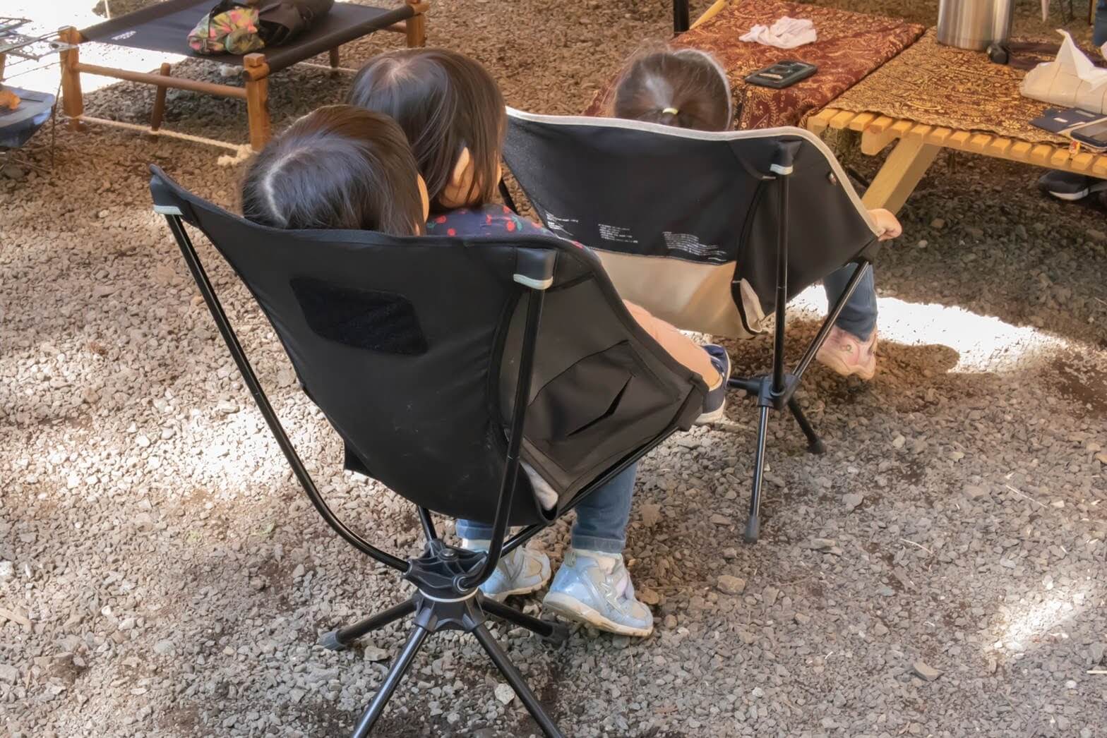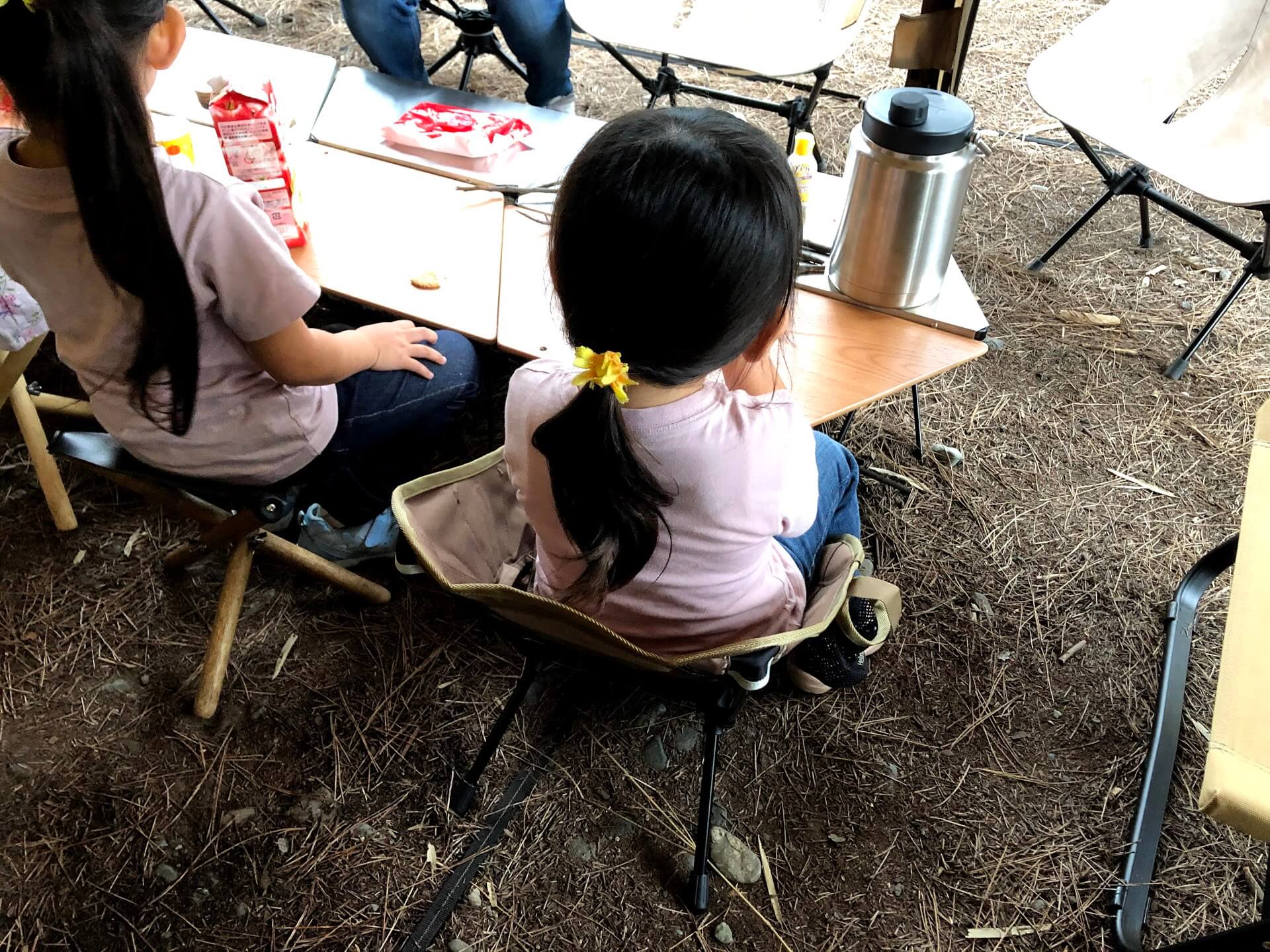 大人用の大きなヘリノックスに子供が座ると、座面高が高いためチョコンと前方に腰掛けることになり、そうすると前方にコテン!と転がってしまうのですが、タクティカルチェアミニではその心配はありません。