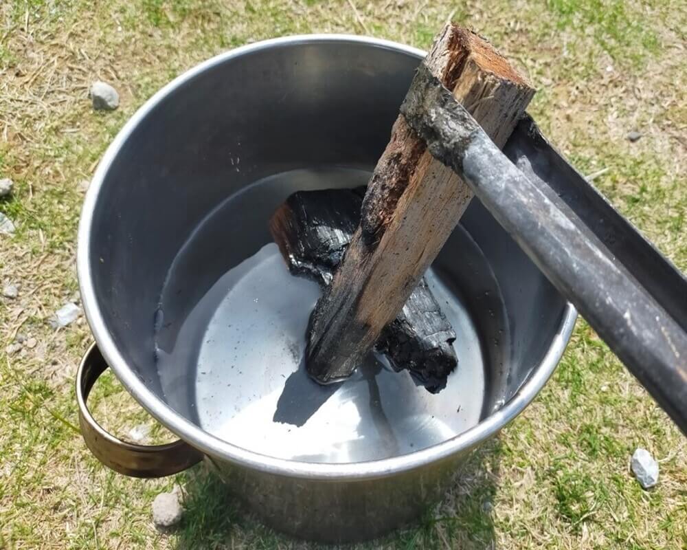 水を使って火を消す場合は、水をたっぷりと入れた容器に、火がついたままの薪や炭を直接入れて消火するようにしましょう。